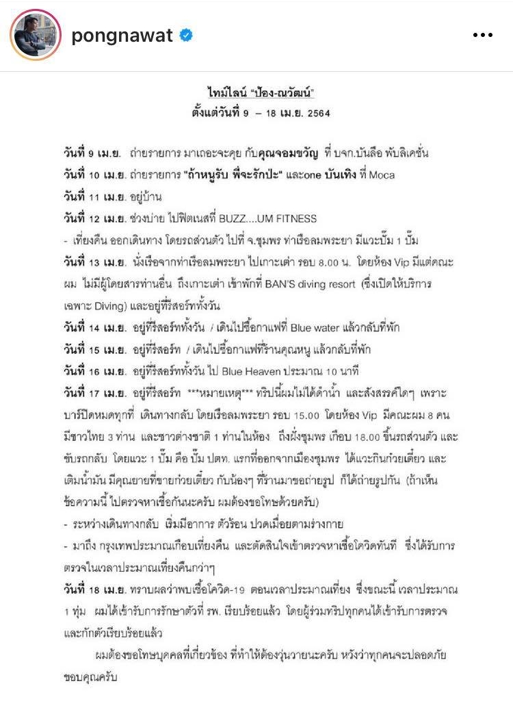 ล่าสุดเมื่อค่ำวานนี้ (18 เม.ย.) ผลตรวจของ “ป้อง ณวัฒน์” ได้รับการยืนยันว่าพบเชื้อโควิด-19 และได้เข้ารักษาที่โรงพยาบาลแล้ว นอกจากนี้ “ป้อง ณวัฒน์” ยังเปิดเผยไทม์ไลน์สำคัญ มีทั้งเดินทางไปถ่ายรายการ พักที่บ้าน ไปฟิตเนส และเดินทางไปท่าเรือลมพระยา จ.ชุมพร โดยรถส่วนตัว ก่อนนั่งเรือไปเกาะเต่า จ.สุราษฎร์ธานี และพักที่รีสอร์ตแห่งหนึ่ง โดยไปแบบส่วนตัว แต่ไม่ได้ดำน้ำ พร้อมกันนี้ยังขออภัยทุกคนที่ได้รับผลกระทบในครั้งนี้