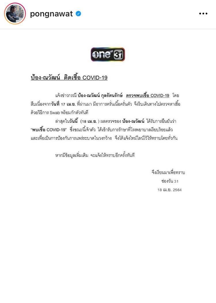 คนบันเทิงรายล่าสุดที่ติดเชื้อโควิด-19 คือ “ป้อง” ณวัฒน์ กุลรัตนรักษ์ พระเอกชื่อดังและพิธีกรหนุ่มมากฝีมือ ซึ่งต้นสังกัดได้ส่งจดหมายถึงสื่อมวลชน ชี้แจงว่า “ป้อง ณวัฒน์” ตรวจพบเชื้อ สืบเนื่องจากวันที่ 17 เมษายน มีอาการครั่นเนื้อครั่นตัว จึงเดินทางไปตรวจหาเชื้อด้วยวิธีการ Swab พร้อมกักตัวทันที