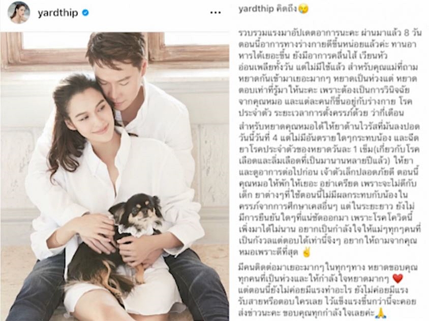 ส่วนดาราสาว “หยาดทิพย์ ราชปาล” และแฟนหนุ่ม ที่ประกาศว่าติดโควิด-19 ไปก่อนหน้านี้ และเข้ารักษาตัวที่โรงพยาบาล ท่ามกลางความเป็นห่วงของแฟนๆ เพราะ “หยาดทิพย์” กำลังตั้งครรภ์ ล่าสุดในอินสตาแกรมของ “หยาดทิพย์” มีการอัปเดตรูปตนเองและสามี พร้อมข้อความเล่าอาการโดยสรุปว่า ตอนนี้อาการทางร่างกายดีขึ้น ทานอาหารได้เยอะขึ้น แต่คลื่นไส้ เวียนหัว โดยแพทย์ให้ยาต้านไวรัสที่ลงปอด และไม่มีอันตรายใดๆ กระทบกับเด็กในครรภ์ แต่ในระยะยาวยังไม่มีการยืนยันที่แน่ชัด พร้อมกันนี้ “หยาดทิพย์” ได้ขอบคุณทุกคนที่เป็นห่วงและ ให้กำลังใจด้วย