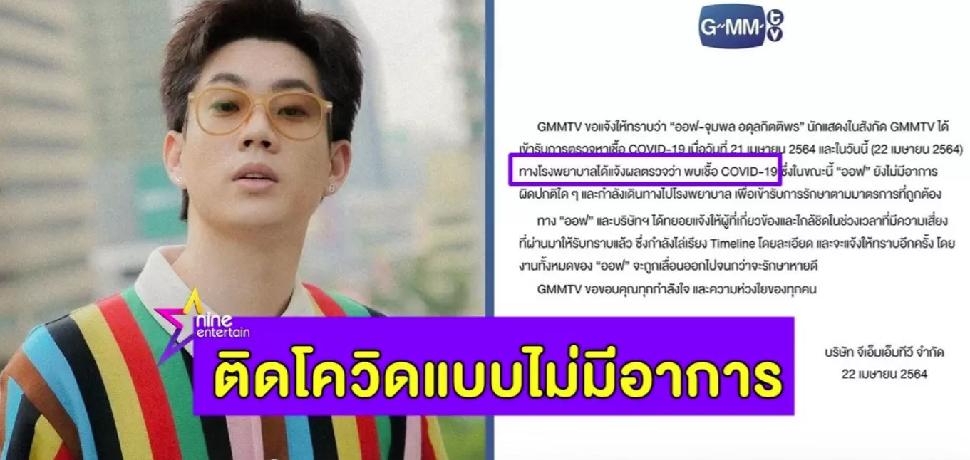 ไนน์เอ็นเตอร์เทน 22 เม.ย. – ค่าย “GMMTV” ร่อนหนังสือแจ้งให้ทราบว่า “ออฟ จุมพล อดุลกิตติพร” นักแสดงในสังกัด GMMTV ได้เข้ารับการตรวจหาเชื้อ COVID-19 เมื่อวันที่ 21 เมษายน และในวันนี้ (22 เมษายน) ทางโรงพยาบาลได้แจ้งผลตรวจว่าพบเชื้อ COVID -19 ซึ่งในขณะนี้ “ออฟ” ยังไม่มีอาการผิดปกติใด ๆ