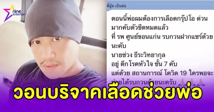 ไนน์เอ็นเตอร์เทน 21 ก.ค. – “อู้ด เป็นต่อ” ขอรับบริจาคเลือดกรุ๊ปโอ ช่วยพ่อที่กำลังป่วยโรคหัวใจ