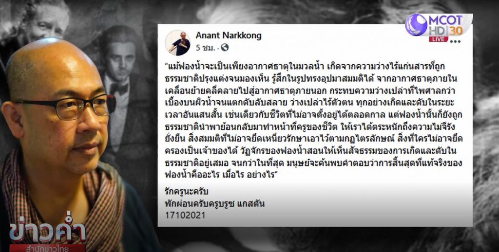 เช่นเดียวกับการจากไปของอาจารย์บรูซ แกสตัน อาจารย์อนันต์ นาคคง แห่งวงก่อไผ่ ได้โพสต์เฟซบุ๊กการเสียชีวิตของอาจารย์บรูซ แกสตัน โดยมีข้อความว่า “แม้ฟองน้ำจะเป็นเพียงอากาศธาตุในมวลน้ำ เกิดจากความว่างไร้แก่นสารที่ถูกธรรมชาติปรุงแต่งจนมองเห็น รู้สึกในรูปทรงอุปมาสมมติได้ จากอากาศธาตุภายในเคลื่อนย้ายคลี่คลายไปสู่อากาศธาตุภายนอก กระทบความว่างเปล่าที่ไพศาลกว่าเบื้องบนผิวน้ำจนแตกดับลับสลาย ว่างเปล่าไร้ตัวตน ทุกอย่างเกิดและดับในระยะเวลาอันแสนสั้น เช่นเดียวกับชีวิตที่ไม่อาจตั้งอยู่ได้ตลอดกาล แต่ฟองน้ำนั้นก็ยังถูกธรรมชาตินำพาย้อนกลับมาทำหน้าที่ครูของชีวิต ให้เราได้ตระหนักถึงความไม่จีรังยั่งยืน สิ่งสมมติที่ไม่อาจยึดเหนี่ยวรักษาเอาไว้ตามกฎไตรลักษณ์ สิ่งที่ใครไม่อาจยึดครองเป็นเจ้าของได้ วัฏจักรของฟองน้ำสอนให้เห็นสัจธรรมของการเกิดและดับในธรรมชาติอยู่เสมอ จนกว่าในที่สุด มนุษย์จะค้นพบคำตอบว่าการสิ้นสุดที่แท้จริงของฟองน้ำคืออะไร เมื่อไร อย่างไร” รักครูนะครับ พักผ่อนครับครูบรูซ แกสตัน