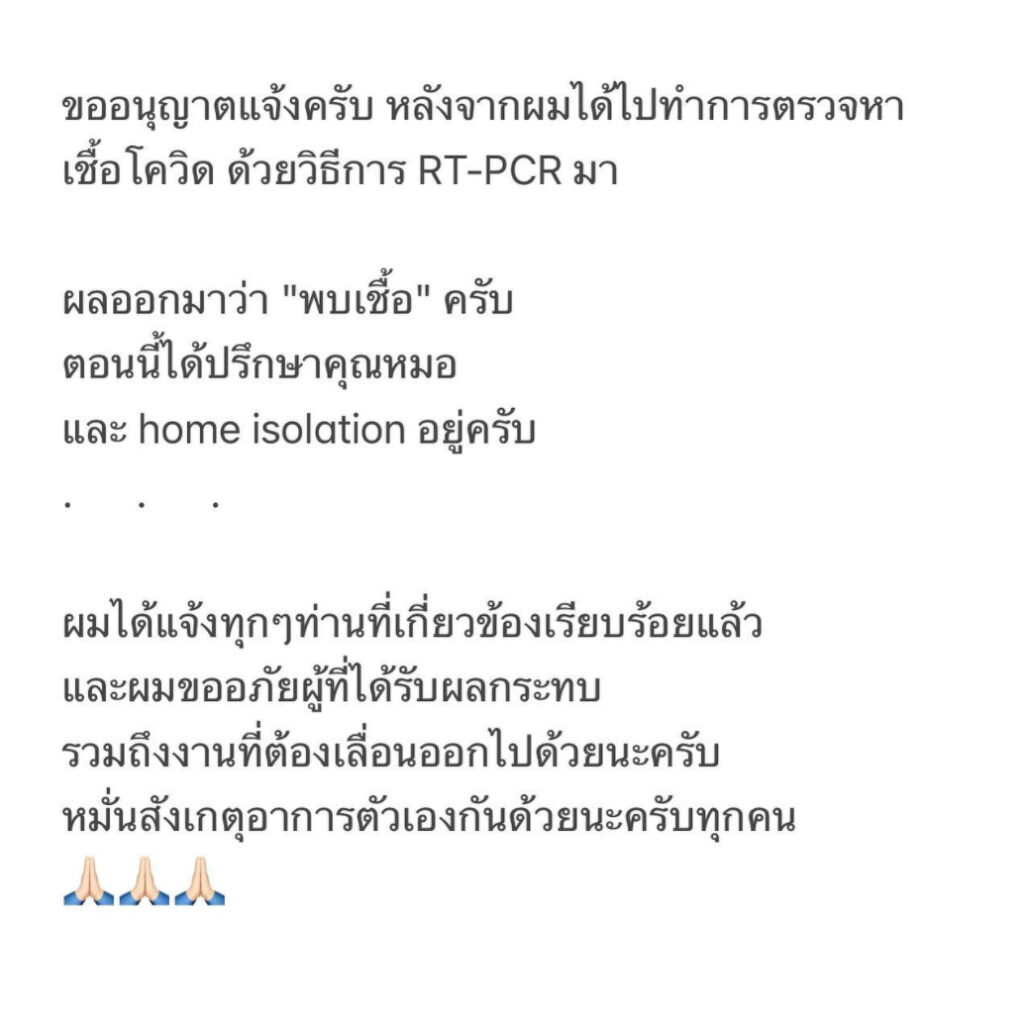 ส่วนหนุ่มอาเล็ก เผย “ขออนุญาตแจ้งครับ หลังจากผมได้ไปทำการตรวจหาเชื้อโควิด ด้วยวิธีการ RT-PCR มา ผลออกมาว่า “พบเชื้อ” ครับ ตอนนี้ได้ปรึกษาคุณหมอ และ home isolation อยู่ครับ ผมได้แจ้งทุกๆท่านที่เกี่ยวข้องเรียบร้อยแล้ว และผมขออภัยผู้ที่ได้รับผลกระทบ รวมถึงงานที่ต้องเลื่อนออกไปด้วยนะครับ หมั่นสังเกตอาการตัวเองกันด้วยนะครับทุกคน” .-สำนักข่าวไทย