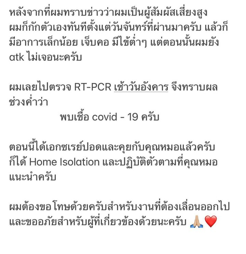 โดยหนุ่มเกรท ระบุ “หลังจากที่ผมทราบข่าวว่าผมเป็นผู้สัมผัสเสี่ยงสูง ผมก็กักตัวเองทันทีตั้งแต่วันจันทร์ที่ผ่านมาครับ แล้วก็มีอาการเล็กน้อย เจ็บคอ มีไข้ต่ำๆ แต่ตอนนั้นผมยัง atk ไม่เจอนะครับ ผมเลยไปตรวจ RT-PCR เช้าวันอังคาร จึงทราบผลช่วงค่ำว่าพบเชื้อ covid-19 ครับ ตอนนี้ได้เอกซเรย์ปอดและคุยกับคุณหมอแล้วครับ ก็ได้ Home Isolation และปฏิบัติตัวตามที่คุณหมอ
