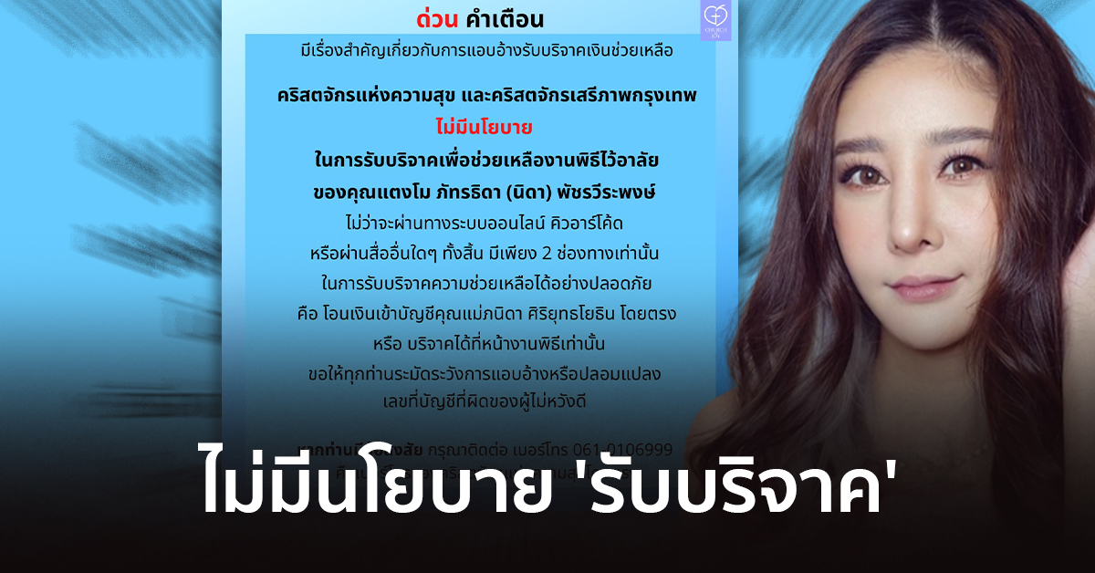 กทม. 6 มี.ค.- คริสตจักรแห่งความสุข และคริสตจักรเสรีภาพกรุงเทพ แจ้งเตือนไม่มีนโยบาย รับบริจาคเพื่อช่วยเหลืองานพิธีไว้อาลัย “แตงโม” ภัทรธิดา (นิดา) พัชรวีระพงษ์ ไม่ว่าจะผ่านทางระบบออนไลน์ คิวอาร์โค้ดหรือผ่านสื่ออื่นใดๆ ทั้งสิ้น