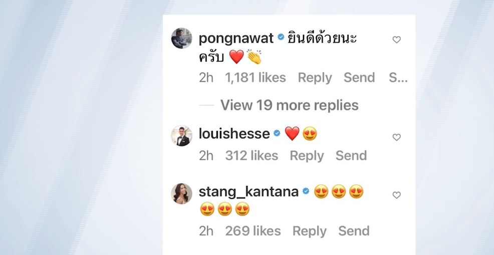 ท่ามกลางเพื่อนนักแสดง และแฟนๆ ที่เข้ามากดไลก์กว่า 200,000 ไลก์ และแสดงความยินดีอย่างมากมายกว่า 7,000 ข้อความ เช่น “ป้อง” ณวัฒน์ ยินดีด้วยนะครับ, มิก ทองระย้า และแซมมี่ คาวเวล พระเอกนางเอกรุ่นน้องร่วมช่อง 7 ยินดีด้วยนะคร้าบ, คอนเกรทค่า
