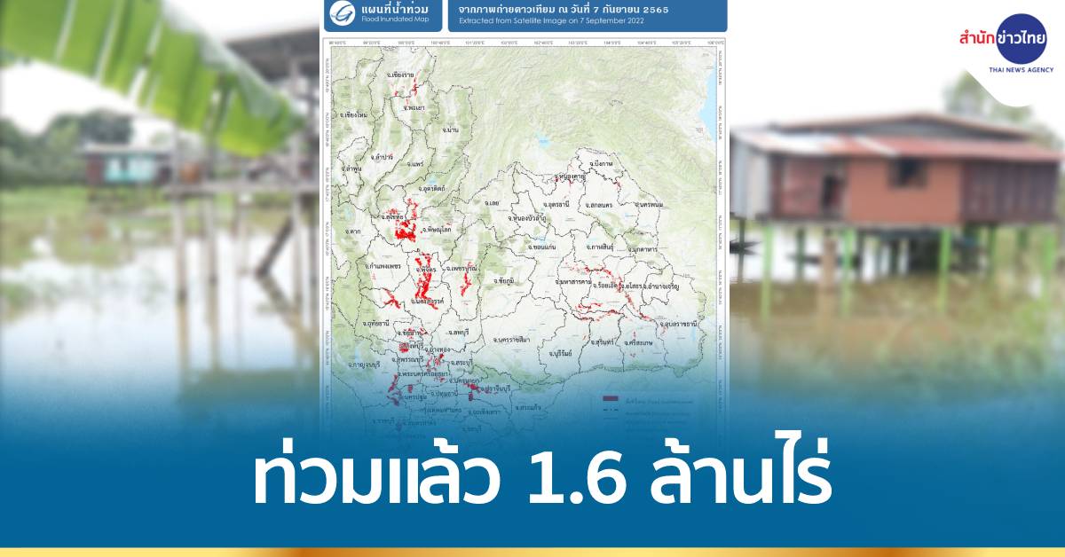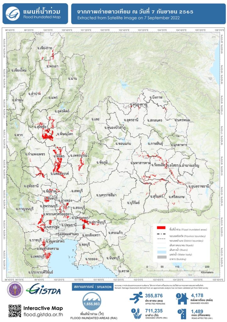 GISTDA ใช้ดาวเทียม Radarsat-2 และดาวเทียม Sentinel-1 ของวันที่ 7 กันยายน 2565 ติดตามสถานการณ์น้ำท่วม ล่าสุดพบพื้นที่น้ำท่วมขังแล้ว 1,655,983 ไร่ ในหลายพื้นที่ของลุ่มน้ำสำคัญที่กระจายอยู่เกือบทุกภูมิภาคของประเทศ อาทิ ลุ่มน้ำโขงเหนือ ลุ่มน้ำโขงตะวันออกเฉียงเหนือ ลุ่มน้ำชี ลุ่มน้ำมูล ลุ่มน้ำปิง ลุ่มน้ำวัง ลุ่มน้ำยม ลุ่มน้ำน่าน ลุ่มน้ำเจ้าพระยา ลุ่มน้ำสะแกกรัง ลุ่มน้ำบางประกง ลุ่มน้ำท่าจีน ลุ่มน้ำแม่กลอง ลุ่มน้ำเพชรบุรีประจวบคีรีขันธ์ และลุ่มน้ำชายฝั่งทะเลตะวันตก ในขณะที่พื้นที่นาข้าวได้รับผลกระทบแล้วทั้งสิ้น 711,235 ไร่