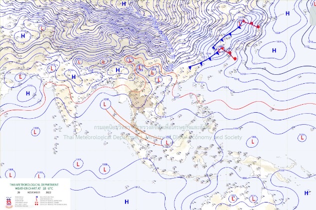 นางสาวชมภารี ชมภูรัตน์ อธิบดีกรมอุตุนิยมวิทยากล่าวว่า ตั้งแต่วันที่ 30 พ.ย. – 1 ธ.ค. 65 จะเริ่มมีมวลอากาศเย็นแผ่ลงมาปกคลุมทางภาคเหนือและภาคตะวันออกเฉียงเหนือตอนบนจึงทำให้ประเทศไทยตอนบนฝนเริ่มลดลงบ้าง แต่ยังเมฆเยอะและมีฝนบางแห่ง หลังวันที่ 2 ธ.ค. อากาศจะเริ่มเย็นลง โดยอุณหภูมิจะลดลง 1-5 องศาเซลเซียส ส่วนภาคใต้ยังต้องเฝ้าระวังฝนตกหนัก โดยเฉพาะภาคใต้ตอนกลางในช่วงวันที่ 2 – 5 ธ.ค. 65 เนื่องจากลมหนาวที่แรงขึ้นประกอบกับมีหย่อมความกดอากาศต่ำกำลังแรงก่อตัวบริเวณทะเลจีนใต้ตอนล่าง คาดว่า จะเคลื่อนตัวเข้าสู่บริเวณอ่าวไทยในช่วงวันที่ 3 – 5 ธ.ค. 65 นอกจากนี้คลื่นลมจะะแรงขึ้นด้วย จึงขอให้ชาวเรือและชาวประมงเดินเรือด้วยความระวัง
