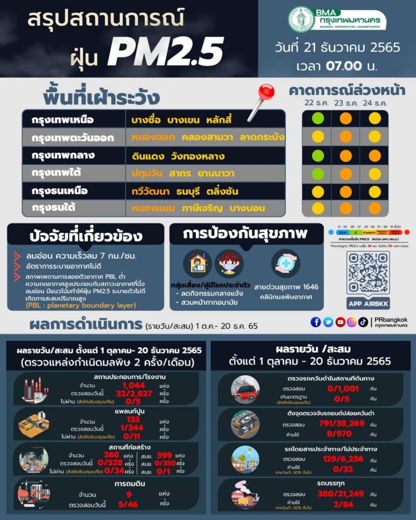 สำหรับวันที่ 24 ธ.ค. 65 เป็นช่วงเวลาที่ควรเฝ้าระวังทั้งพื้นที่ กทม. เนื่องจากสภาพเพดานการลอยตัวอากาศที่ต่ำ ประกอบสภาวะอากาศที่นิ่ง ลมสงบ ควรเริ่มเฝ้าระวังตั้งแต่เย็นวันที่ 23 ธ.ค.65.-สำนักข่าวไทย