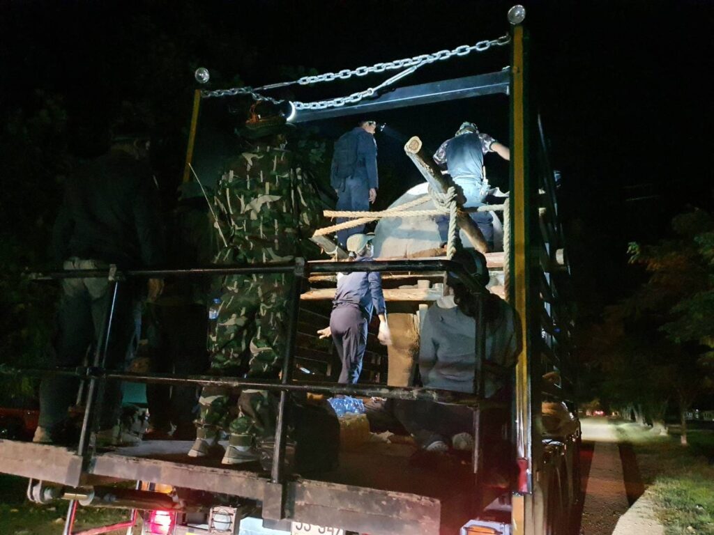 ทีมสัตวแพทย์และเจ้าหน้าที่ใช้เวลาดำเนินการจับและเคลื่อนย้ายช้างตัวนี้กลับป่าถึง 5 วัน เริ่มตั้งแต่แกะรอยด้วยการติดตามรอยเท้าในช่วงเวลากลางวันและใช้โดรนบินหาตอนกลางคืน จนกระทั่งพบตัว แต่ช้างรู้ตัว มันจึงพยายามเข้ารวมฝูง ทำให้เพิ่มความเสี่ยงในการปฏิบัติงาน ในที่สุดก็สามารถยิงยาซึมและนำขึ้นรถบรรทุกสำหรับเคลื่อนย้ายช้างโดยเฉพาะ มีสัตวแพทย์ 5 นายควบคุมและดูแลช้างระหว่างเคลื่อนย้ายไปยังเขตรักษาพันธุ์สัตว์ป่าเขาอ่างฤาไน สัตวแพทย์ให้ยาแก้ยาซึมซึ่งช้างรู้สึกตัวดีและเดินเข้าป่าลึกไป ปฏิบัติการเป็นไปด้วยความเรียบร้อยทั้งช้างและเจ้าหน้าที่ปลอดภัย