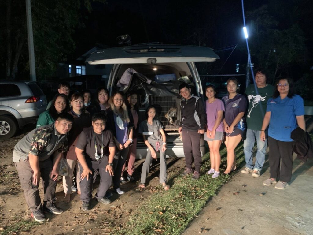 เมื่อจัดทำเอกสารการขนย้ายแล้ว สัตวแพทย์ได้ปตรวจประเมินสุขภาพลูกเสืออีกครั้งพบว่า พฤติกรรมร่าเริงดี การกินและการขับถ่ายเป็นปกติ จากนั้นเวลา 18.00 น. ให้นมและอาหารแก่ลูกเสือ เมื่ออาหารย่อย ลูกเสือเริ่มมีอาการง่วงนอน ในเวลา 19.00 น. จึงเริ่มนำลูกเสือเข้ากรงที่อยู่ภายในรถตู้ที่เตรียมไว้ แล้วออกเดินทาง