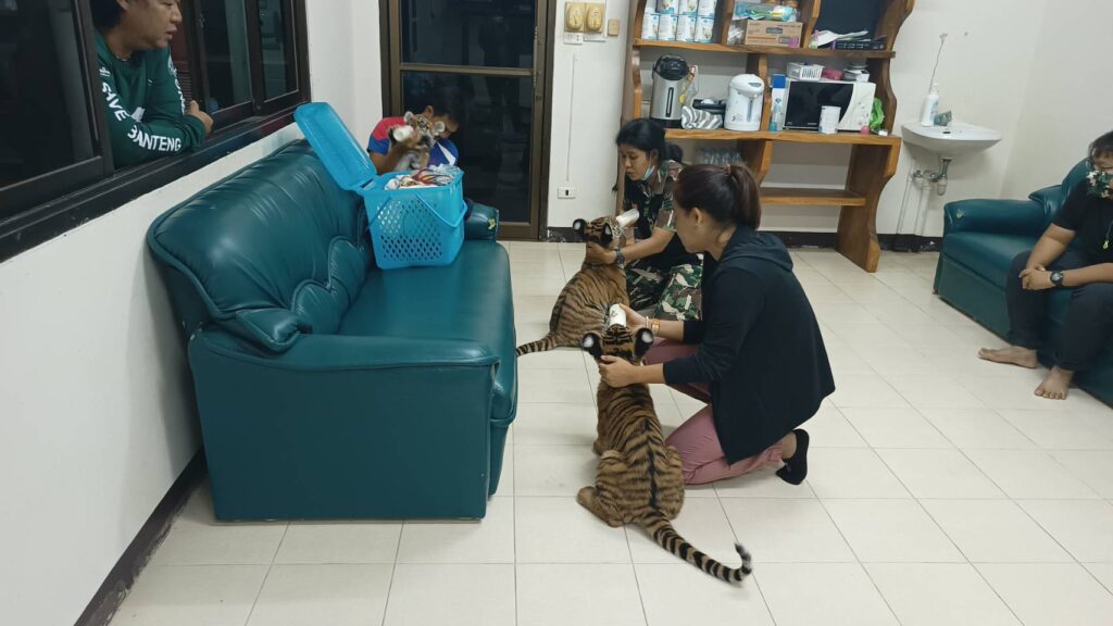 นายสัตวแพทย์ภัทรพล มณีอ่อน หรือหมอล็อต หัวหน้ากลุ่มงานจัดการสุขภาพสัตว์ป่า กรมอุทยานแห่งชาติ สัตว์ป่า และพันธุ์พืชกล่าวว่า ระหว่างขนย้ายลูกเสือมีสัตวแพทย์และสัตวบาลดูแลอย่างใกล้ชิด ลูกเสือโคร่งทั้ง 3 ตัวนอนหลับตลอดการเดินทาง เนื่องจากเป็นทีมสัตวแพทย์วางแผนการเดินทางช่วงกลางคืน ตามพฤติกรรมของลูกเสือโคร่งทั้ง 3 ตัวซึ่งนอนหลับช่วงเวลากลางคืน ระหว่างการขนย้ายได้ตรวจอาการลูกสัตว์ทุก 1 ชั่วโมง พร้อมให้รายงานอาการและสุขภาพสัตว์เป็นระยะๆ หากมีอาการเวียนหัว เมารถ หายใจลำบาก และน้ำลายยืด กำหนดให้พิจารณาพักค้างคืน 1 คืนที่เขตรักษาพันธุ์สัตว์ป่าดงใหญ่หรืออุทยานแห่งชาติน้ำตกสามหลั่น จังหวัดสระบุรี แต่ไม่เกิดเหตุฉุกเฉินใดๆ จึงเคลื่อนย้ายมาถึงศูนย์พัฒนาการจัดการสัตว์ป่าบึงฉวาก จังหวัดสุพรรณบุรีเป็นที่เรียบร้อยในเวลา 03.33 น. ที่ผ่านมา รวมระยะเวลาเดินทาง 8 ชั่วโมง 33 นาที