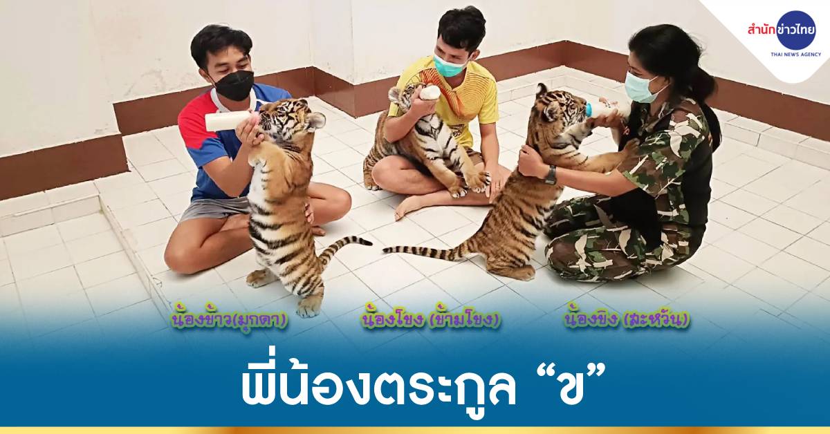 สุพรรณบุรี 18 ม.ค. – ลูกเสือโคร่งของกลาง 3 ตัว ที่เคลื่อนย้ายจาก สบอ.9 จ.อุบลราชธานี มายังศูนย์พัฒนาการจัดการสัตว์ป่าบึงฉวาก จ.สุพรรณบุรี วันนี้ สัตวแพทย์ตรวจติดตามอาการแล้ว พบปกติ ร่าเริง และกินเก่ง พร้อมเปลี่ยนชื่อใหม่ “ขิง-ข้าว-โขง” เป็นพี่น้องตระกูล “ข” ตาม “น้องขวัญ” ลูกเสือโคร่งของกลางที่อนุบาลที่นี่ก่อนหน้านี้