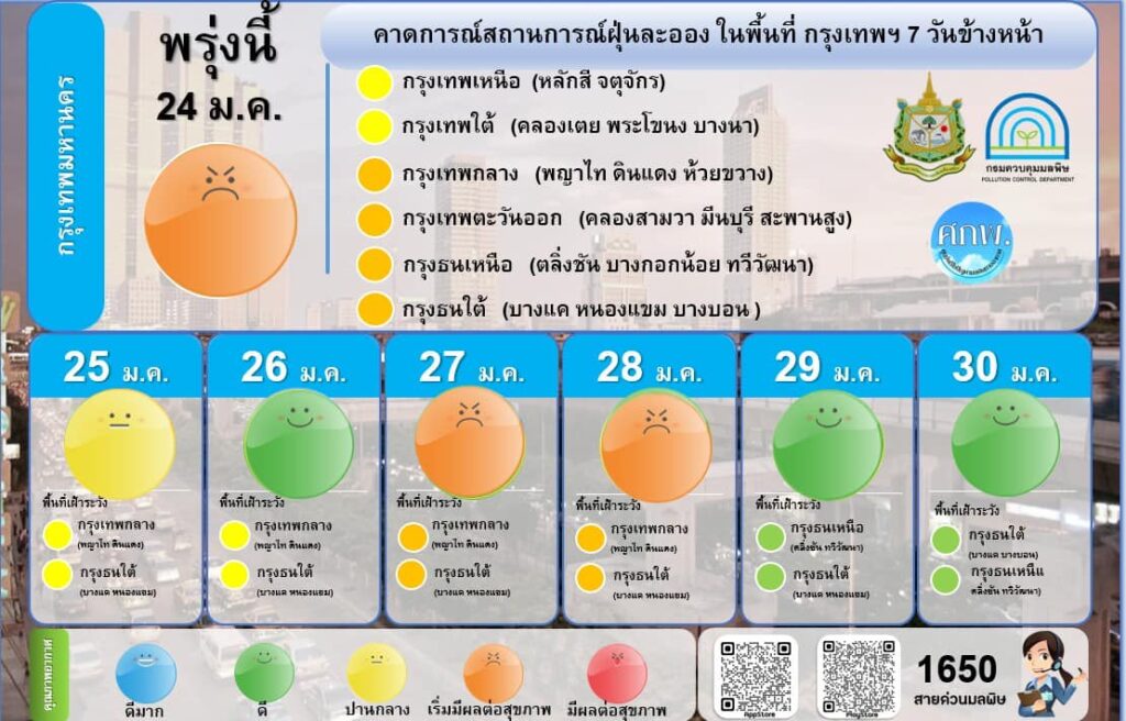 กรมควบคุมมลพิษ (คพ.) รายงานผลการตรวจวัดฝุ่นละอองขนาดเล็ก PM2.5 ในพื้นที่กรุงเทพและปริมณฑลพบว่า เกินค่ามาตรฐาน 36 พื้นที่ ส่วนการคาดการณ์สถานการณ์ระหว่างวันที่ 24 – 30 มกราคม 2566 นั้น ในวันที่ 24 และ 27 – 28 มกราคม ควรเฝ้าระวังการสะสมของฝุ่นละออง เนื่องจากสภาพอากาศที่นิ่งและปิด ประกอบกับมีมวลอากาศเย็นระลอกใหม่จากประเทศจีนแผ่เข้ามา โดยพื้นที่ที่ควรเฝ้าระวัง ได้แก่พื้นที่กรุงเทพกลาง กรุงธนเหนือ และใต้
