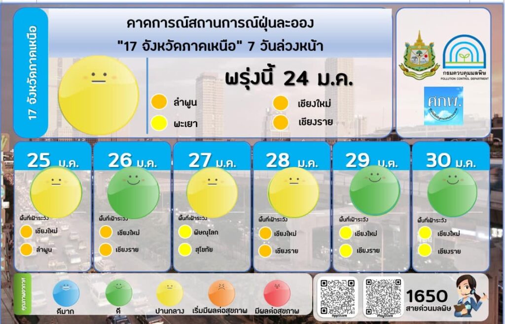สำหรับในพื้นที่ 17 จังหวัดภาคเหนือควรเฝ้าระวังทั้งบริเวณภาคเหนือตอนบนและล่าง โดยเฉพาะช่วงวันที่ 24 – 25 และ 27 – 28 มกราคม 2566