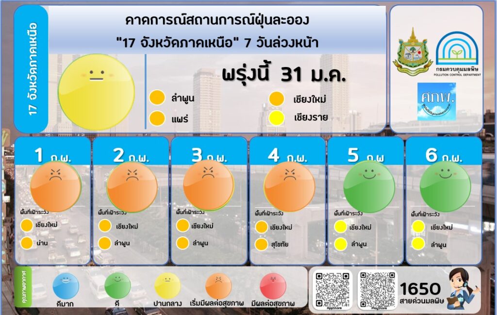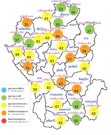 - ภาคเหนือ เกินค่ามาตรฐาน 7 พื้นที่ ตรวจวัดได้ 31 – 70 มคก./ลบ.ม.