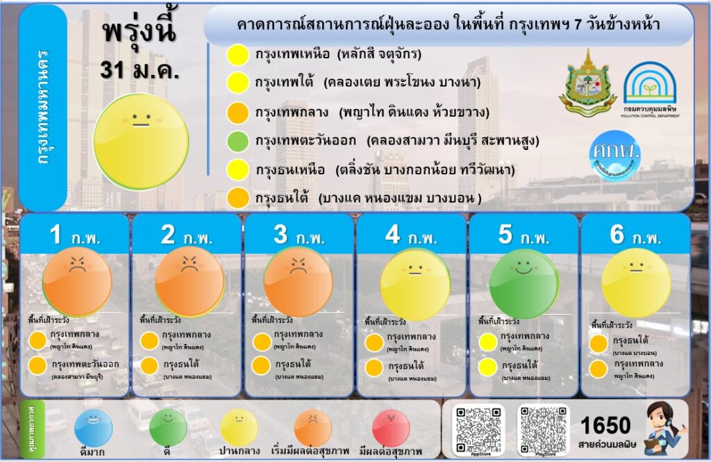 นายปิ่นสักก์ สุรัสวดี อธิบดีกรมควบคุมมลพิษ (คพ.) เปิดเผยว่า ระหว่างวันที่ 1-4 กุมภาพันธ์ 2566 พื้นที่กรุงเทพฯ และปริมณฑลควรเฝ้าระวังการสะสมของฝุ่นละออง เนื่องจากสภาพอากาศที่นิ่งและปิด โดยพื้นที่ที่ควรเฝ้าระวังได้แก่ พื้นที่กรุงเทพกลาง กรุงธนเหนือ และใต้เนื่องจากเป็นพื้นที่ใต้ลม เช่นเดียวกับพื้นที่ภาคเหนือตอนบนและล่างต้องเฝ้าระวังในห้วงเวลาเดียวกัน