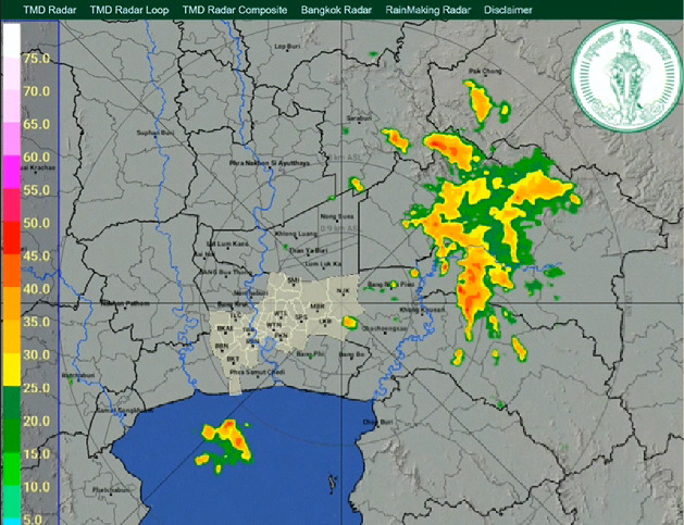 เมื่อเวลา 08.30 น. วันนี้ เรดาร์ตรวจอากาศพบกลุ่มฝนปานกลางถึงหนักบริเวณจังหวัดสมุทรสาครสมุทรปราการ ชลบุรีฉะเชิงเทรา ปราจีนบุรี นครนายก ปทุมธานี นนทบุรี และกรุงเทพมหานคร