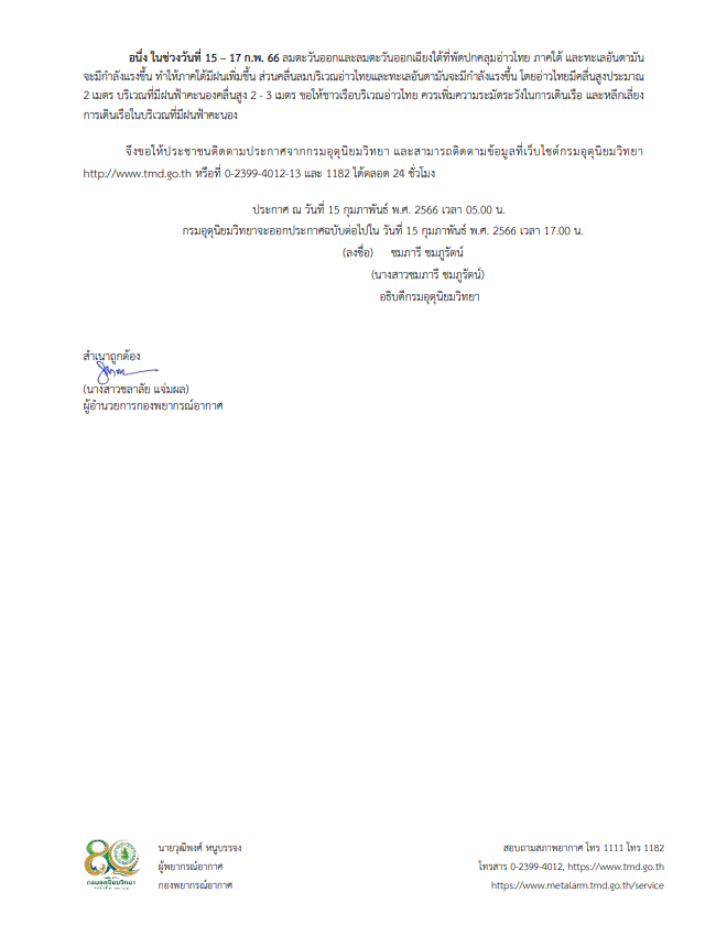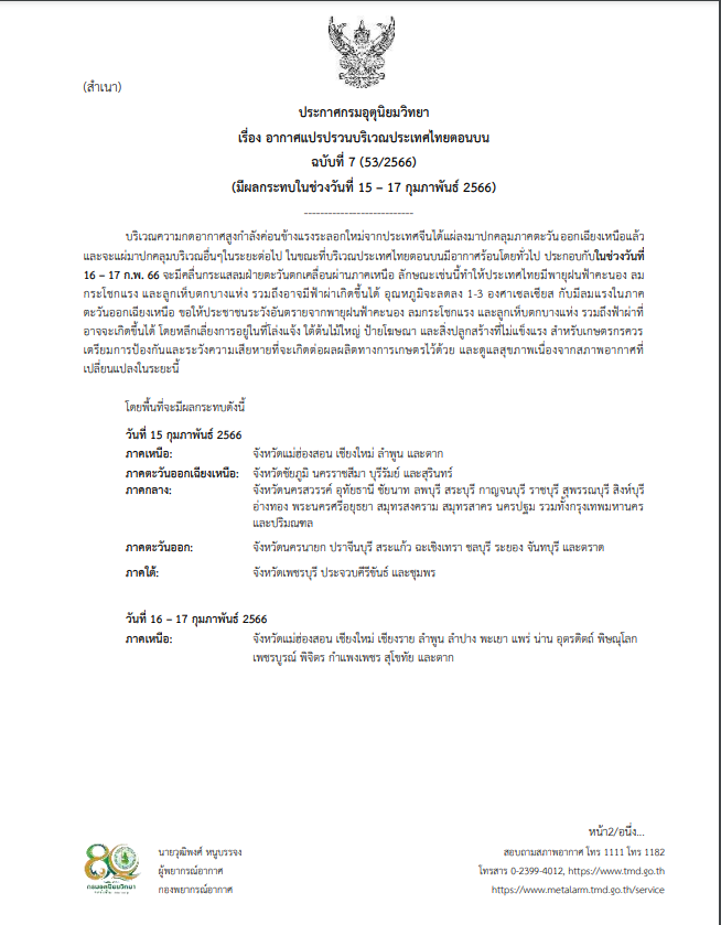 นางสาวชมภารี ชมภูรัตน์ อธิบดีกรมอุตุนิยมวิทยากล่าวว่า ระหว่างวันที่ 15 – 17 ก.พ. ประเทศไทยตอนบนมีสภาพอากาศแปรปรวนเนื่องจากมีมวลอากาศเย็นระลอกใหม่แผ่ลงมาปกคลุม แล้วปะทะกับอากาศร้อน ส่งผลให้มีพายุฝนฟ้าคะนอง เกิดฟ้าร้องและฟ้าผ่าได้ ลมกระโชกแรง และอาจมีลูกเห็บ โดยพื้นที่ที่ต้องเฝ้าระวังคือ ภาคตะวันออกเฉียงเหนือตอนล่าง ภาคกลาง รวมกทม. และปริมณฑล ภาคตะวันออก และภาคใต้ตอนบนคือ ที่จังหวัดเพชรบุรี ประจวบคีรีขันธ์ และชุมพร