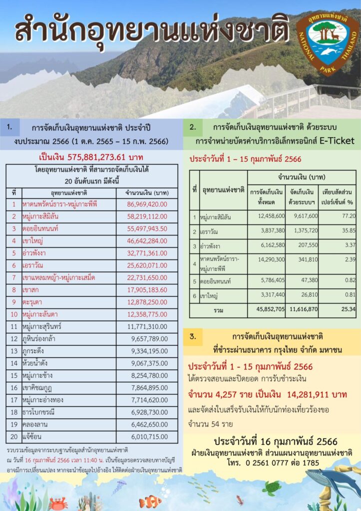 ทั้งนี้กรมอุทยานแห่งชาติฯ จัดทำและพัฒนาระบบการจัดเก็บเงินค่าบริการและระบบการจองล่วงหน้าด้วยระบบเทคโนโลยีสารสนเทศหรือระบบออนไลน์ (E-Ticket) ขึ้นมา วันที่เปิดใช้ระบบวันที่ 1 มกราคม 2566 นำร่องในอุทยานแห่งชาติ 6 แห่งได้แก่ อุทยานแห่งชาติอ่าวพังงา อุทยานแห่งชาติหมู่เกาะสิมิลัน อุทยานแห่งชาติหาดนพรัตน์ธารา-หมู่เกาะพีพี อุทยานแห่งชาติเขาใหญ่ อุทยานแห่งชาติดอยอินทนนท์ และอุทยานแห่งชาติเอราวัณ โดยให้ชำระเงินผ่านบัตรเครติตและเดบิตหรือชำระเงินผ่าน Thai OR Payment เงินเข้าบัญชีของกรมเท่านั้น ลดการจัดเก็บและรักษาเงินของเจ้าหน้าที่อุทยานแห่งชาติเพื่อให้เกิดความโปร่งใสและลดปัญหาการทุจริตจากการเก็บค่าธรรมเนียมหรือค่าบริการของอุทยานแห่งชาติต่างๆ
