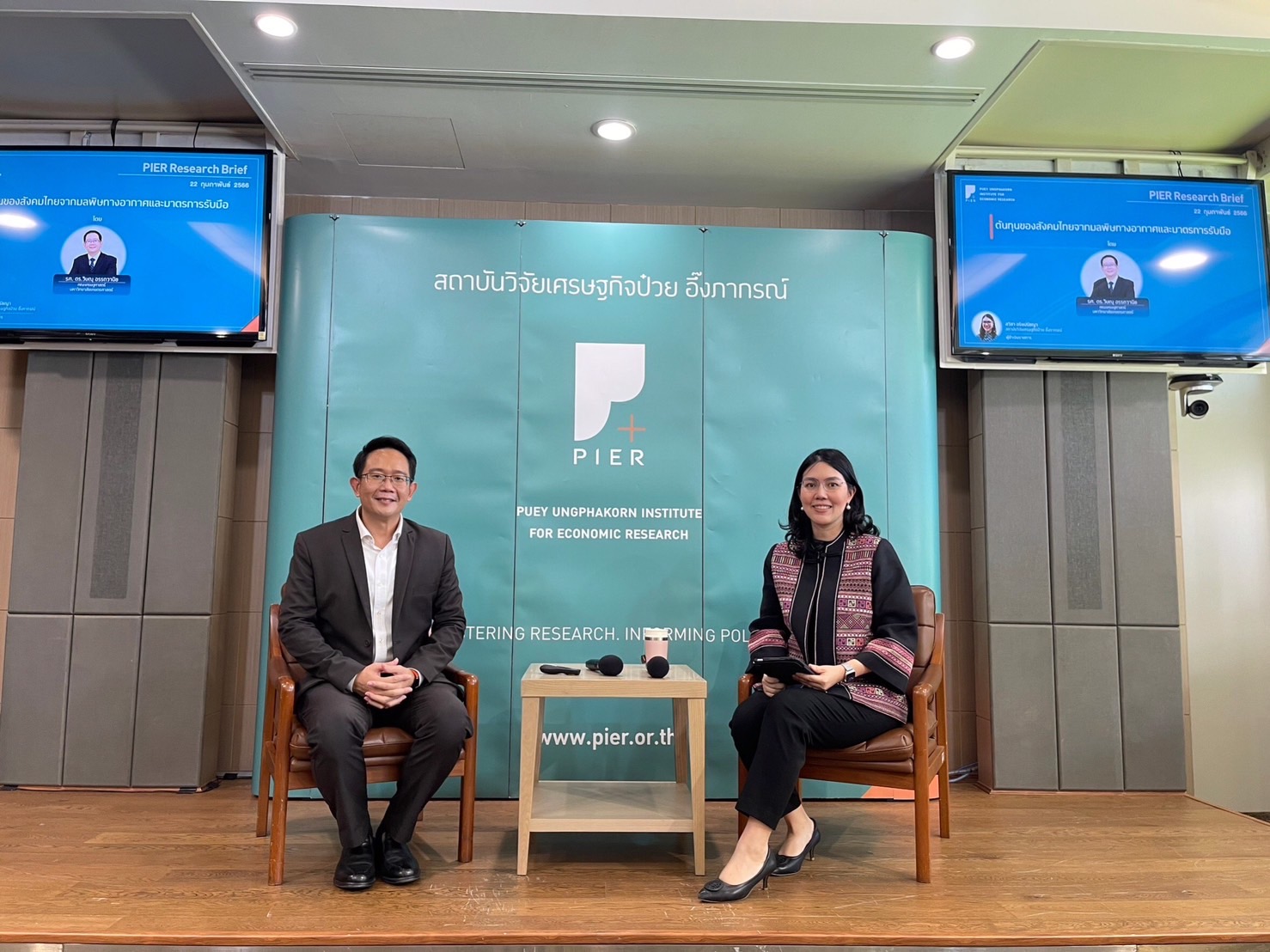 สถาบันวิจัยเศรษฐกิจป๋วย อึ๊งภากรณ์นำเสนอผลงานวิจัยของ รศ.ดร.วิษณุ อรรถวานิช รองศาสตราจารย์ประจำคณะเศรษฐศาสตร์ มหาวิทยาลัยเกษตรศาสตร์หัวข้อ ต้นทุนของสังคมไทยจากมลพิษทางอากาศและมาตรการรับมือ “ฝุ่นจิ๋ว…กับผลกระทบที่ไม่จิ๋ว…ต่อครัวเรือนไทย!” ซึ่งได้ประเมินมูลค่าความเสียหายทางเศรษฐศาสตร์จากมลพิษทางอากาศต่อสังคมไทย โดยใช้ข้อมูลจากการสำรวจความพึงพอใจและความสุขในชีวิตของชาวไทยและรายได้ครัวเรือนของสำนักงานสถิติแห่งชาติ แบบสำรวจข้อมูลความจำเป็นพื้นฐานและข้อมูลประชากรของกระทรวงมหาดไทย ตลอดจนข้อมูลคุณภาพอากาศจากกรมควบคุมมลพิษ งานวิจัยทำการประมาณมูลค่าความเต็มใจจ่ายเพื่อลดมลพิษทางอากาศด้วยวิธี subjective well-being ตามแนวคิดทางเศรษฐศาสตร์สิ่งแวดล้อม ซึ่งเชื่อว่าความพึงพอใจในชีวิตของมนุษย์ขึ้นอยู่กับหลายปัจจัย เช่น ระดับรายได้ สถานะทางสุขภาพ สภาพสังคม และคุณภาพสิ่งแวดล้อม โดยสมมติว่าครัวเรือนจะได้รับผลกระทบเชิงลบต่อสุขภาพหากระดับความเข้มข้นของมลพิษทางอากาศในจังหวัดที่อาศัยอยู่สูงกว่าค่าแนะนำรายปีขององค์การอนามัยโลก