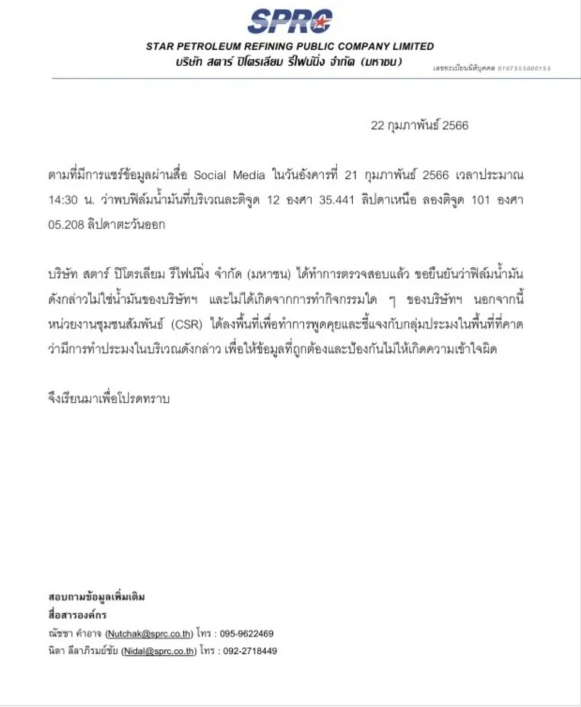 ด้านบริษัท สตาร์ ปีโตรเลียม รีไฟนนิ่ง จำกัด (มหาชน) หรือ SPRC ซึ่งเป็นต้นเหตุน้ำมันรั่วลงสู่ทะเลจังหวัดระยองเมื่อต้นปี 2565 ออกแถลงการณ์ยืนยันว่า ฟิล์มน้ำมันดังกล่าวไม่ใช่น้ำมันของบริษัทและไม่ได้เกิดจากการทำกิจกรรมของบริษัทแต่อย่างใด.-สำนักข่าวไทย