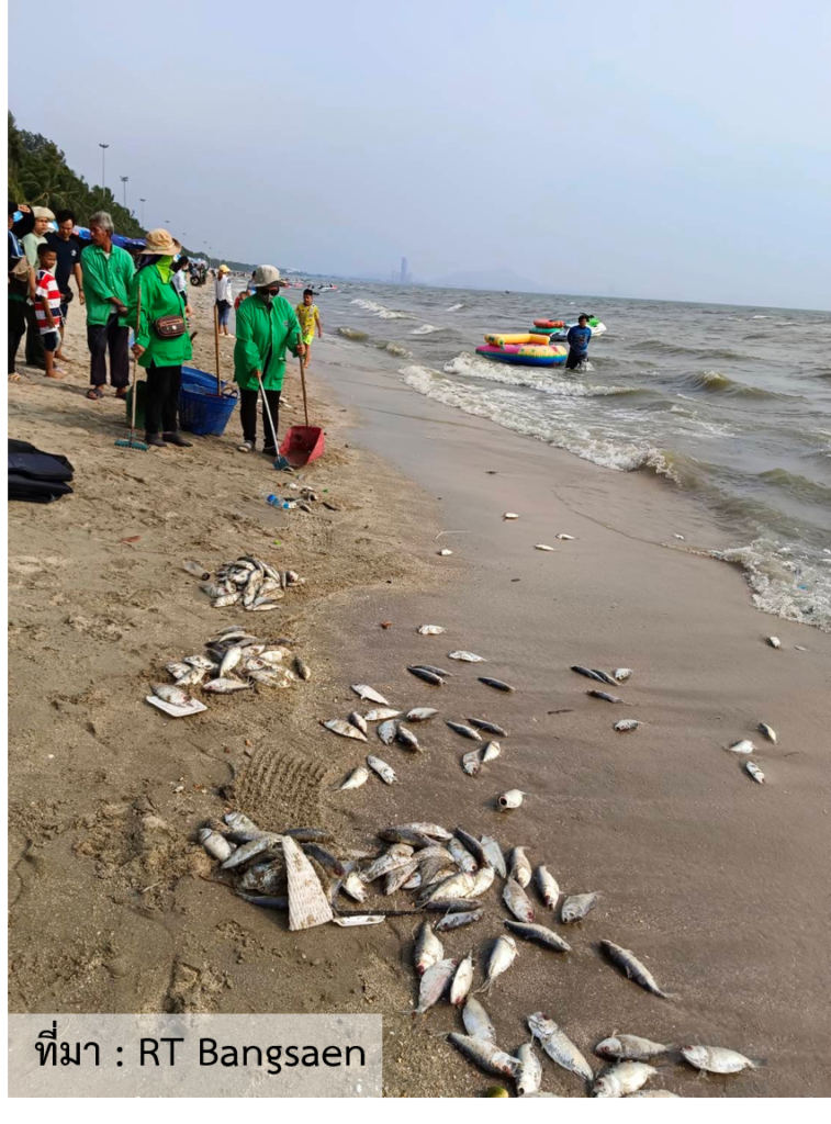 นายอภิชัย เอกวนากุล รองอธิบดีกรมทรัพยากรทางทะเลและชายฝั่ง รักษาราชการแทนอธิบดีกรมทรัพยากรทางทะเลและชายฝั่งกล่าวว่า ศูนย์วิจัยทรัพยากรทางทะเลและชายฝั่งอ่าวไทยตอนบนฝั่งตะวันออก (ศวบอ.) สำนักงานทรัพยากรทางทะเลและชายฝั่งที่ 2 รายงานผลการตรวจสอบสาเหตุการตายของปลาที่ถูกน้ำทะเลซัดขึ้นมาเกยหาดบางแสน จังหวัดชลบุรีตามที่ได้รับแจ้งจากเทศบาลเมืองแสนสุขเมื่อเวลาประมาณ 17:20 น. พบการขึ้นเกยหาดของปลาทะเลจำนวนมากบริเวณชายหาดบางแสน ตำบลแสนสุข อำเภอเมืองชลบุรี จังหวัดชลบุรี โดยพบว่า ปลาที่ตายเป็นปลาชนิดเดียวกันคือ “ปลาตะเพียนน้ำเค็ม” ชื่อวิทยาศาสตร์คือ Anodontostoma chacunda มีชื่อเรียกอีกว่า ปลาโคกหรือปลามักคา เป็นปลาน้ำเค็มและน้ำกร่อยชนิดหนึ่ง ในวงศ์ปลาหลังเขียว