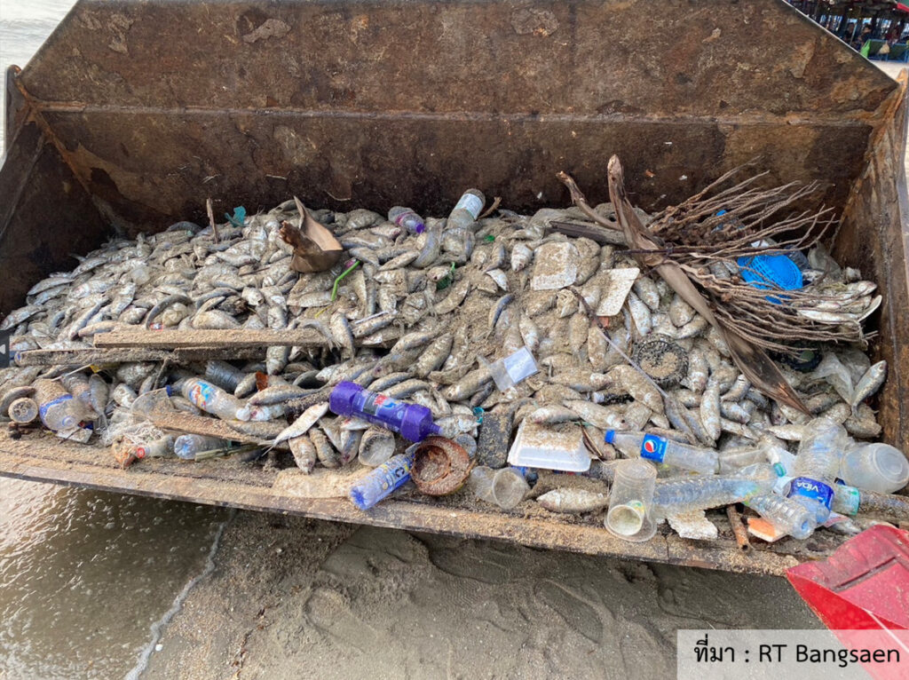 ทั้งนี้ซากปลาที่เกยหาดมีขนาดใกล้เคียงกันทั้งหมด ยาวประมาณ 20 เซนติเมตร จึงตรวจสอบข้อมูลจากเครือข่ายอนุรักษ์ ผู้ประกอบการแพปลา และเรือประมงในพื้นที่พบว่า เรือประมงอวนล้อมได้ออกจับปลาปลาตะเพียนน้ำเค็มที่ชุกชุมมากในระยะนี้ ปริมาณที่จับได้มากถึงวันละหลายหมื่นกิโลกรัม โดยขณะทำการประมง อวนที่จับปลาเกิดขาด ทำให้ปลาที่จับได้หลุดลอยและถูกคลื่นลมซัดไปเกยบริเวณชายหาดบางแสน