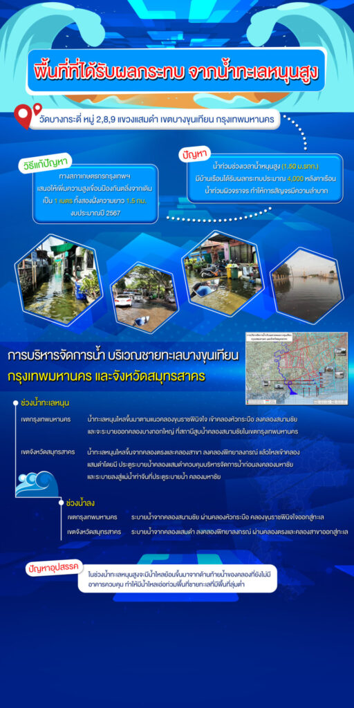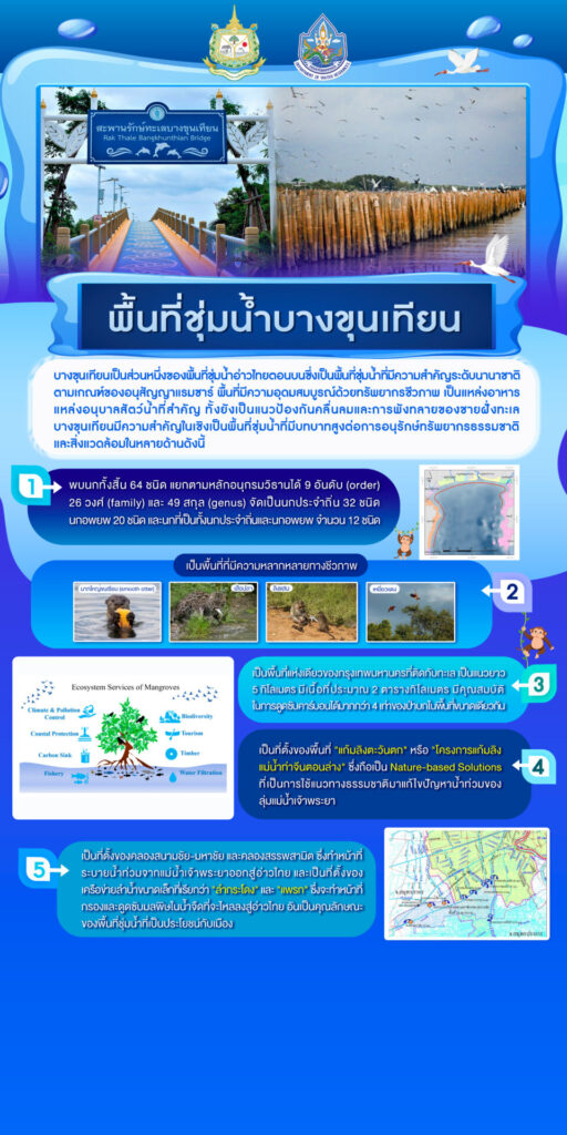 นายอภิชัย เอกวนากุล รองอธิบดีกรมทรัพยากรทางทะเลและชายฝั่ง รักษาราชการแทนอธิบดีกรมทรัพยากรทางทะเลและชายฝั่ง (ทช.) เปิดเผยว่า ในส่วนกรมทรัพยากรทางทะเลและชายฝั่ง (ทช.) มีภารกิจที่เกี่ยวข้องในเขตบางขุนเทียน เป็นพื้นที่เพียงแห่งเดียวของกรุงเทพมหานครที่ติดทะเล ซึ่งอยู่ในความดูแลของกรุงเทพมหานคร โดยสถานภาพชายฝั่งของกรุงเทพมหานครในปัจจุบัน มีระยะทางชายฝั่งประมาณ 7.11 กิโลเมตร มีสภาพพื้นที่เป็นหาดโคลนอยู่ในแนวทางการฟื้นฟูเสถียรภาพชายฝั่ง (Coastal rehabilitation) เป็นพื้นที่ที่ประสบปัญหาการกัดเซาะชายฝั่ง ได้มีการดำเนินการแก้ไขในพื้นที่ดังกล่าวแล้วทั้งหมด แต่ยังมีการกัดเซาะอยู่ประมาณ 2.60 กิโลเมตร และไม่มีการกัดเซาะเพิ่มระยะทาง 4.51 กิโลเมตร ปัจจุบันมีโครงการป้องกันและแก้ไขปัญหาการกัดเซาะชายฝั่งของกรุงเทพฯ ในรูปแบบต่างๆ ไม่ว่าจะเป็นการปักไม้ไผ่ชะลอคลื่น การปักเสาคอนกรีต เขื่อนหินป้องกันคลื่นนอกชายฝั่ง และเขื่อนหินทิ้ง เพื่อแก้ไขปัญหาการกัดเซาะชายฝั่ง ภายหลังการก่อสร้างโครงสร้างป้องกันการกัดเซาะชายฝั่ง แนวชายฝั่งในเขตบางขุนเทียนเริ่มปรับตัวเข้าสู่สมดุลใหม่ ไม่พบการเปลี่ยนแปลงแนวชายฝั่งที่เป็นผลมาจากปัญหาการกัดเซาะชายฝั่ง ในระยะเวลา 3 ปีย้อนหลัง