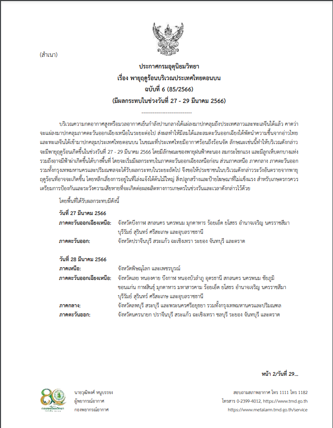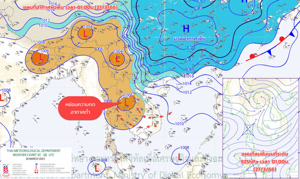 นางสาวชมภารี ชมภูรัตน์ อธิบดีกรมอุตุนิยมวิทยากล่าวว่า บริเวณความกดอากาศสูงหรือมวลอากาศเย็นกำลังปานกลางจะแผ่ลงมาปกคลุมภาคตะวันออกเฉียงเหนือตอนบนในเย็นถึงค่ำวันนี้ ส่งผลทำให้มีลมใต้และลมตะวันออกเฉียงใต้พัดนำความชื้นจากอ่าวไทยและทะเลจีนใต้เข้ามาปกคลุมประเทศไทยตอนบน เมื่อปะทะกับหย่อมความกดอากาศต่ำจากความร้อนที่ทำให้ประเทศไทยมีอากาศร้อนถึงร้อนจัดในขณะนี้ จะส่งผลให้มีพายุฤดูร้อนเกิดขึ้นในช่วงวันที่ 27-29 มีนาคม