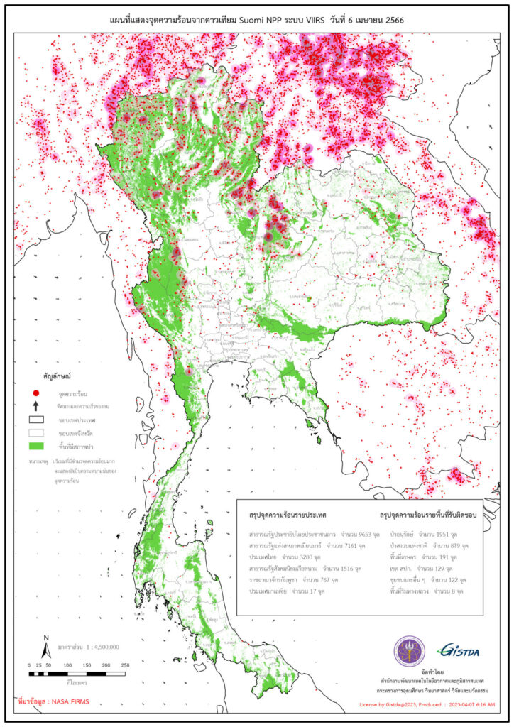 GISTDA เผยข้อมูลจากดาวเทียมซูโอมิ เอ็นพีพี (Suomi NPP) ของวันที่ 6 เมษายน 2566 พบจุดความร้อนในลาวมากที่สุด 9,653 จุด เมียนมา 7,161 จุด ส่วนไทยพบ 3,280 จุด ส่วนเวียดนาม 1,516 จุด กัมพูชา 767 และมาเลเซีย 17 จุด