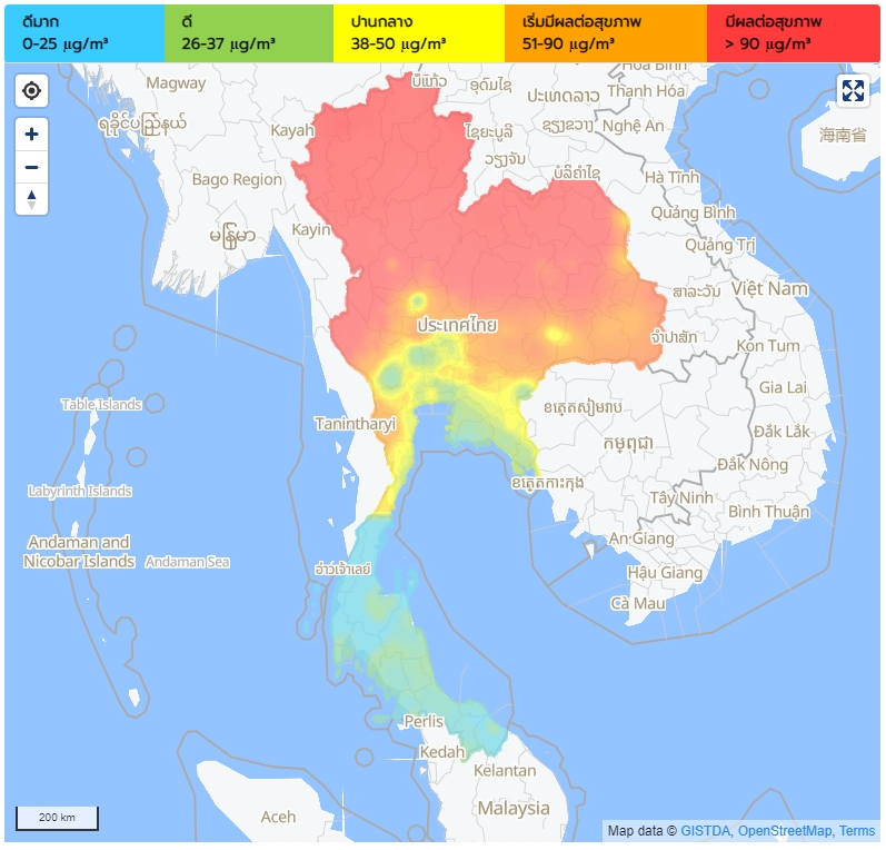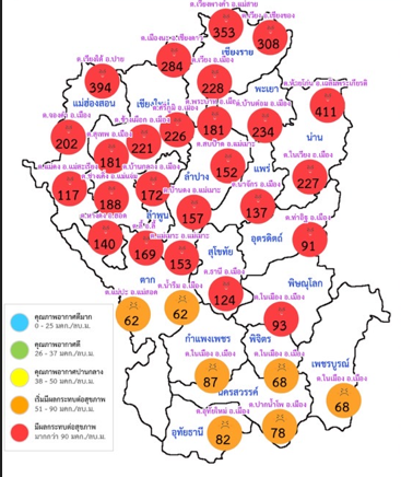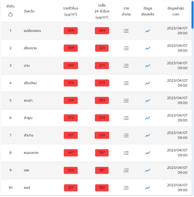 ศูนย์แก้ไขปัญหามลพิษทางอากาศ รายงานการติดตามตรวจสอบคุณภาพอากาศประจำวันที่ 7 เมษายน 2566 ณ 07:00 น. พบค่า PM2.5 ในประเทศเกินค่ามาตรฐานใน 38 จังหวัดได้แก่ กรุงเทพฯ จ.สมุทรสาคร จ.สมุทรปราการ จ.เชียงราย จ.เชียงใหม่ จ.น่าน จ.แม่ฮ่องสอน จ.พะเยา จ.ลำพูน จ.ลำปาง จ.แพร่ จ.อุตรดิตถ์ จ.สุโขทัย จ.ตาก จ.พิษณุโลก จ.พิจิตร จ.เพชรบูรณ์ จ.นครสวรรค์ จ.อุทัยธานี จ.ชัยนาท จ.สิงห์บุรี จ.ลพบุรี จ.สระบุรี จ.อ่างทอง จ.สุพรรณบุรี จ.พระนครศรีอยุธยา จ.ราชบุรี จ.บึงกาฬ จ.หนองคาย จ.เลย จ.นครพนม จ.หนองบัวลำภู จ.สกลนคร จ.มุกดาหาร จ.ขอนแก่น จ.กาฬสินธุ์ จ.ชัยภูมิ และจ. อุบลราชธานี
