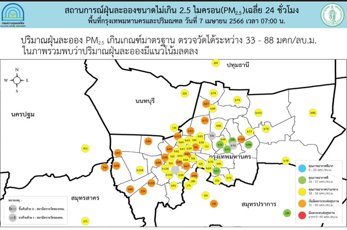 ขณะที่กรุงเทพมหานครและปริมณฑลวันนี้ พบค่าคุณภาพอากาศส่วนใหญ่อยู่ในระดับปานกลาง และคาดการณ์ว่า ตั้งแต่วันที่ 8 เมษายนเป็นต้นไปสถานการณ์ยังคงมีแนวโน้มที่ดี เนื่องจากสภาพอากาศที่เปิดมากขึ้น เพดานการลอยตัวอากาศที่สูงขึ้น ประกอบกับลมทางใต้ที่กำลังแรงช่วยพัดพาฝุ่นละอองออกจากพื้นที่ แต่วันที่ 14 เมษายน อาจมีสภาพอากาศที่ปิดได้ในบางพื้นที่ จึงควรเพิ่มการเฝ้าระวัง