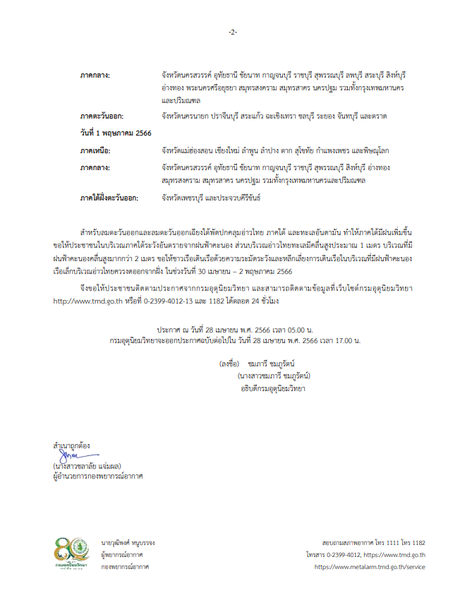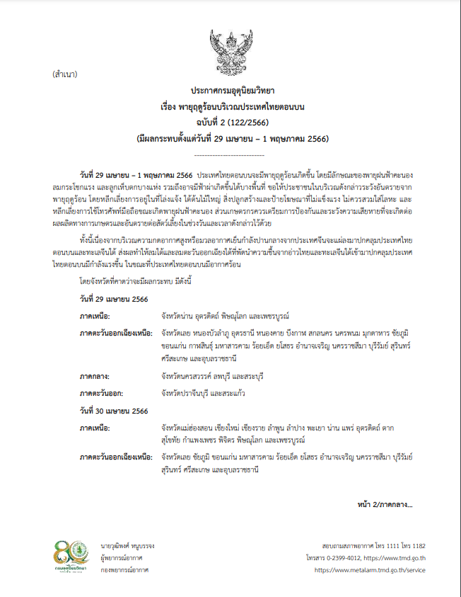 นางสาวชมภารี ชมภูรัตน์ อธิบดีกรมอุตุนิยมวิทยากล่าวว่า ได้ออกประกาศเตือนให้เฝ้าระวังพายุฤดูร้อนบริเวณประเทศไทยตอนบนระหว่างวันที่ 29 เม.ย. – 1 พ.ค. เนื่องจากบริเวณความกดอากาศสูงหรือมวลอากาศเย็นกำลังปานกลางจากประเทศจีนจะแผ่ลงมาปกคลุมประเทศไทยตอนบนและทะเลจีนใต้ ส่งผลทำให้ลมใต้และลมตะวันออกเฉียงใต้ที่พัดนำความชื้นจากอ่าวไทยและทะเลจีนใต้เข้ามาปกคลุมประเทศไทยตอนบนมีกำลังแรงขึ้น ในขณะที่ประเทศไทยตอนบนมีอากาศร้อน ลักษณะเช่นนี้ทำให้ประเทศไทยตอนบนจะมีพายุฤดูร้อนเกิดขึ้น โดยมีลักษณะของพายุฝนฟ้าคะนอง ลมกระโชกแรง และลูกเห็บตกบางแห่ง รวมถึงอาจมีฟ้าผ่าเกิดขึ้นได้บางพื้นที่