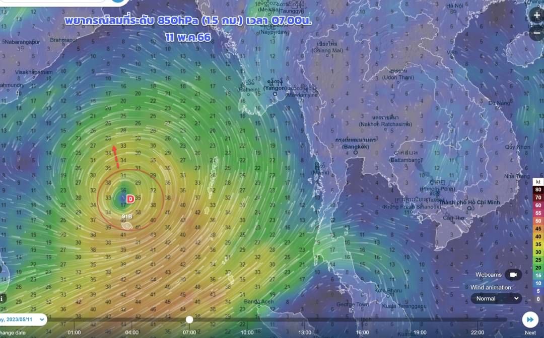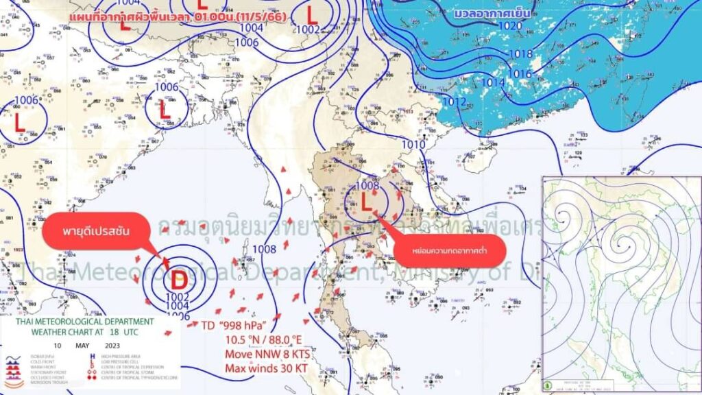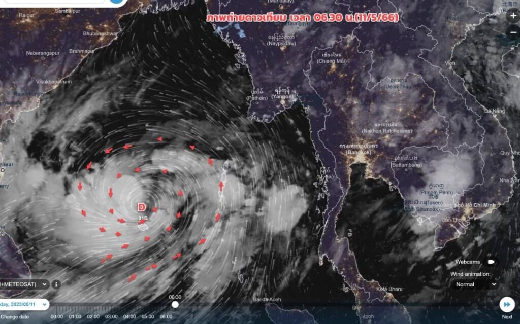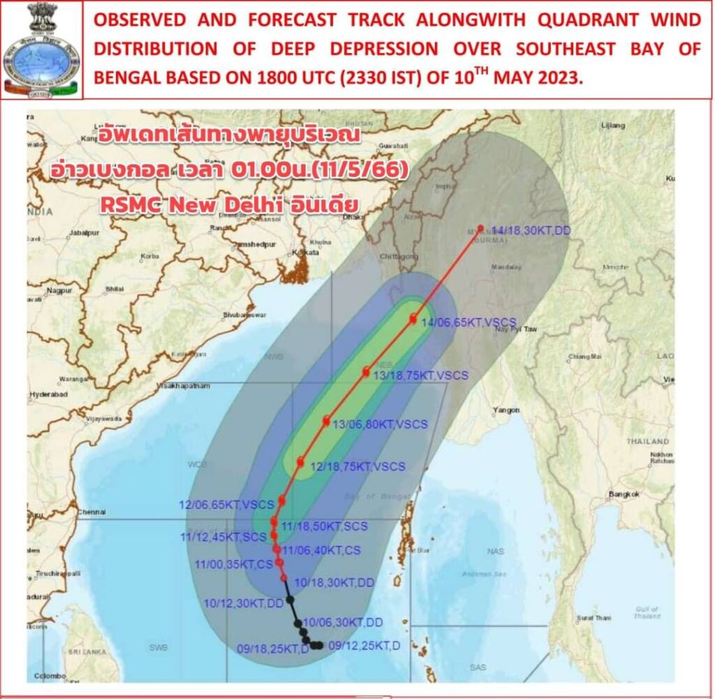 นางสาวชมภารี ชมภูรัตน์ อธิบดีกรมอุตุนิยมวิทยากล่าวว่า พายุดีเปรสชันในอ่าวเบงกอลตอนบนเป็นดีเปรสชันกำลังแรง คาดว่า ช่วงเวลา 10.00 – 11.00 น. วันนี้ จะทวีกำลังแรงขึ้นเป็นพายุไซโคลนซึ่งจะได้ชื่อว่า “MOCHA” หรือ “โมคา” ในภาษาไทย ขณะนี้พายุกำลังเคลื่อนตัวทางทิศเหนือและคาดว่า ศูนย์กลางจะเคลื่อนขึ้นฝั่งบริเวณประเทศเมียนมาตอนบนหรือบังคลาเทศในวันที่ 14 พ.ค. แม้ศูนย์กลางของพายุนี้จะไม่เคลื่อนเข้าสู่ประเทศไทย แต่จะทำให้ลมตะวันตกเฉียงใต้พัดปกคลุมทะเลอันดามันและประเทศไทยมีกำลังแรงขึ้น ดังนั้นในวันที่ 14 พ.ค. ซึ่งตรงกับวันเลือกตั้ง ประเทศไทยตอนบนมีฝนตกและมีฝนตกหนักบางแห่งทางด้านตะวันตกของภาคกลาง ภาคเหนือ และภาคตะวันออกเฉียงเหนือตอนบน นอกจากนี้จะส่งผลให้คลื่นลมบริเวณทะเลอันดามันและอ่าวเบงกอลตอนบนมีกำลังแรง ขอให้ชาวเรือและชาวประมงต้องเดินเรือด้วยความระมัดระวัง