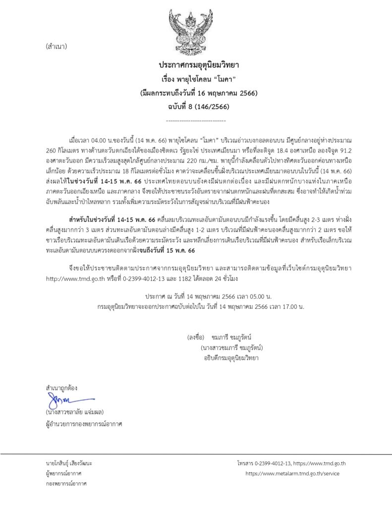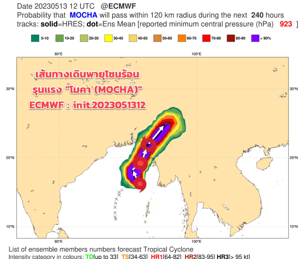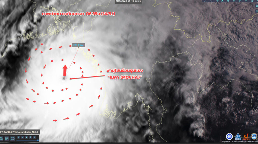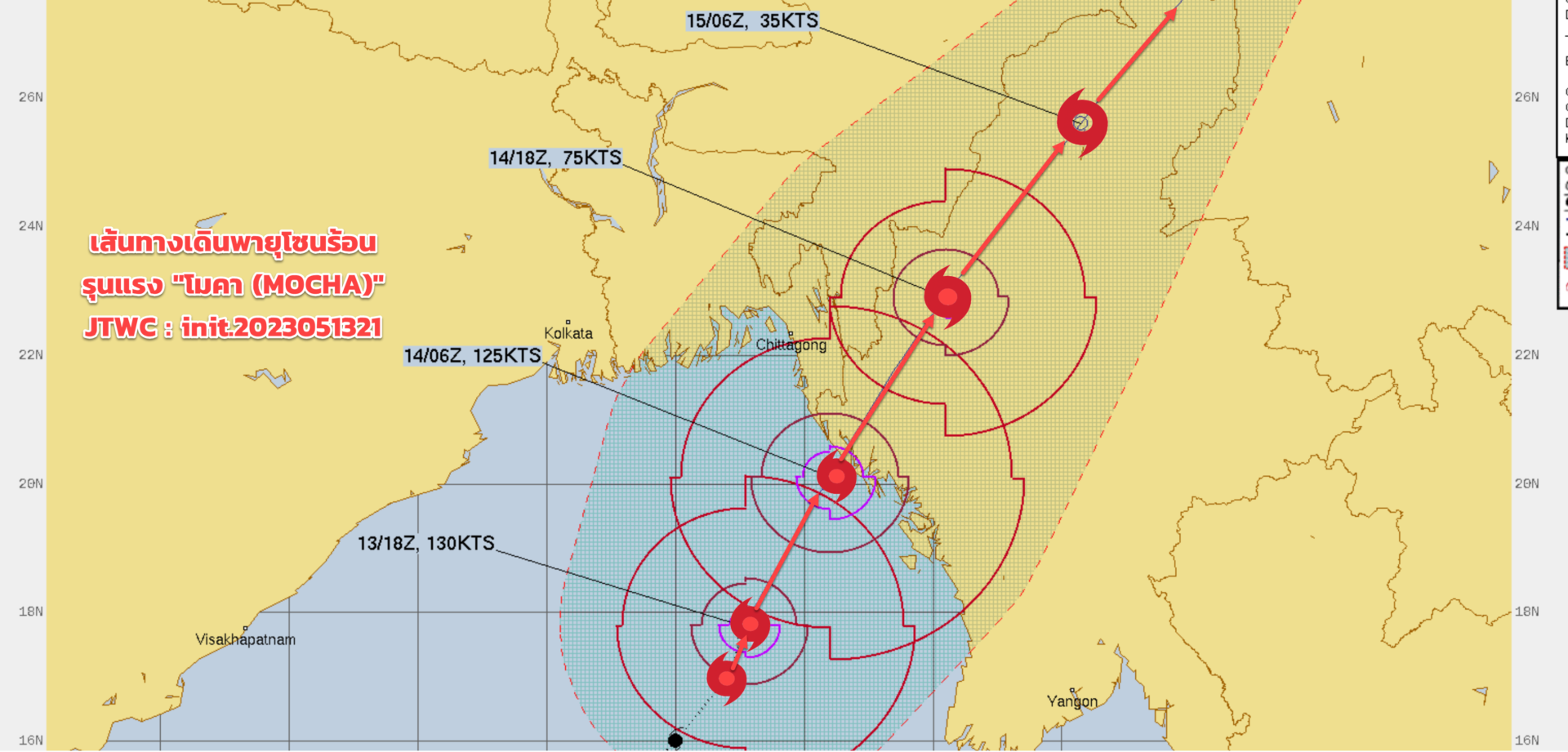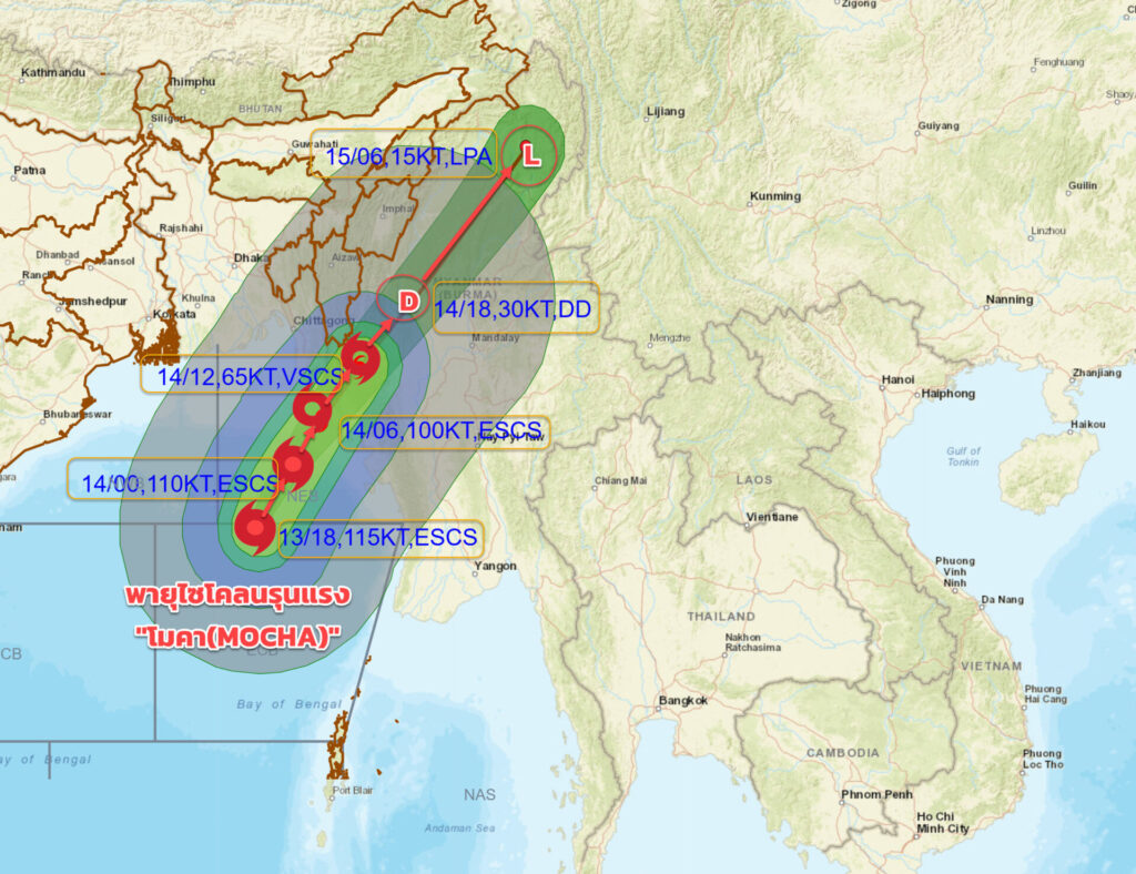 นางสาวชมภารี ชมภูรัตน์ อธิบดีกรมอุตุนิยมวิทยากล่าวว่า พายุไซโคลนรุนแรง “โมคา (MOCHA)” บริเวณอ่าวเบงกอลตอนบน ยังแรงต่อเนื่อง โดยศูนย์อุตุนิยมวิทยาชำนัญพิเศษประจำภูมิภาค (RSMC New Delhi) ประเทศอินเดียให้แรงระดับเป็น Extremely Severe Cyclonic Storm ซึ่งใกล้เคียงกับระดับซูเปอร์ไต้ฝุ่น กำลังเคลื่อนตัวไปทางตะวันออกเฉียงเหนือ คาดว่า ศูนย์กลางของพายุจะเคลื่อนเข้าขึ้นฝั่งประเทศเมียนมาตอนบนและบังคลาเทศ โดยห่างจากทางตอนใต้ของเมืองคอกส์บาซาร์ (Cox’s Bazar) ของบังคลาเทศประมาณ 400 กิโลเมตรและเมืองซิตเว (Sittwe) ประเทศเมียนมา 250 กิโลเมตรในช่วงบ่ายวันนี้ (14 พ.ค.) หลังจากนั้นจะอ่อนกำลังลงตามลำดับ