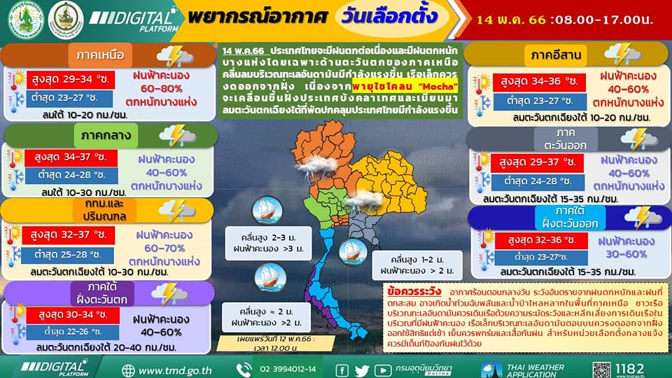 กรุงเทพฯ 14 พ.ค.- กรมอุตุนิยมวิทยาเตือนหลายพื้นที่จะมีฝนตกเพิ่มขึ้นจากอิทธิพลพายุไซโคลน “โมคา” คาดบ่ายนี้พายุจะเคลื่อนขึ้นฝั่งประเทศเมียนมาตอนบนและบังคลาเทศ แต่ขอบของพายุจะส่งผลต่อประเทศไทย รวมทั้งจะทำให้ลมตะวันตกเฉียงใต้ที่พัดปกคลุมทะเลอันดามันและประเทศไทยตอนบนมีกำลังแรง ช่วงบ่ายถึงเย็นจะมีฝนตกหนักบางพื้นที่ในภาคเหนือและภาคอีสานตอนบน แนะให้ออกไปเลือกตั้งช่วงเช้า