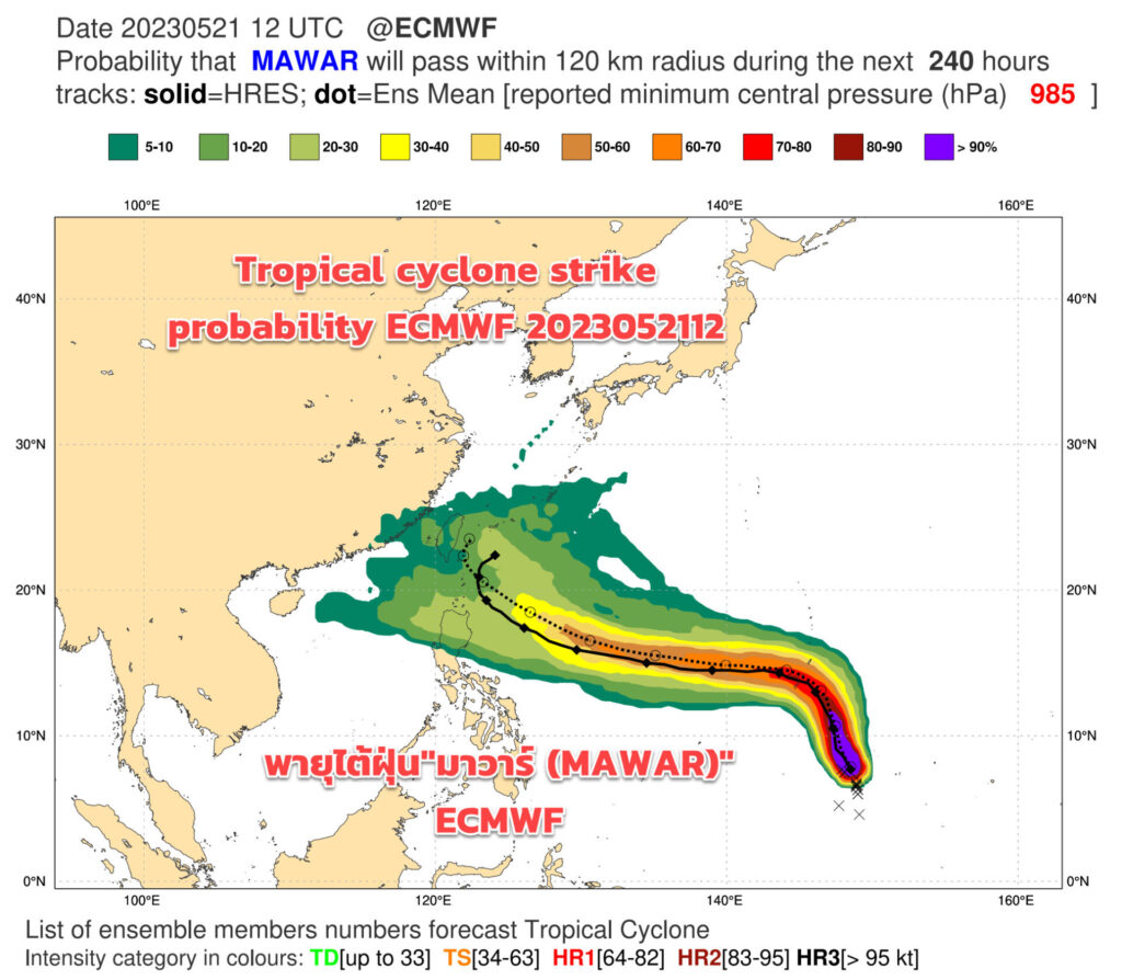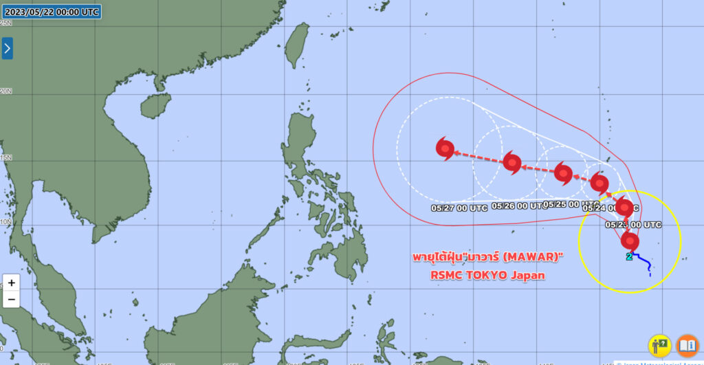 สำหรับพายุ “MAWAR” (มาวาร์) ซึ่งเป็นพายุโซนร้อนลูกที่ 2 ในมหาสมุทรแปซิฟิก ได้ทวีกำลังแรงเป็นพายุไต้ฝุ่นแล้วในช่วงเช้าวันนี้ กำลังเคลื่อนตัวทางตะวันตกเฉียงเหนือ แต่ทิศทางไม่ได้เคลื่อนเข้าสู่ทะเลจีนใต้ จึงไม่ส่งผลกระทบกับสภาพอากาศบ้านเรา