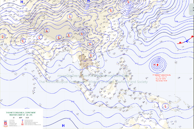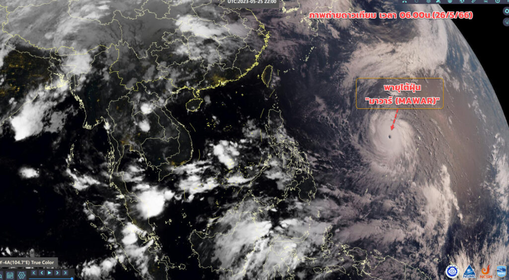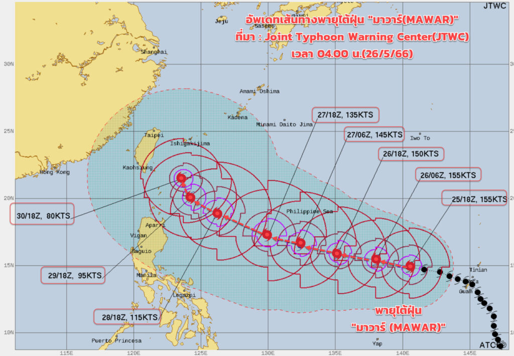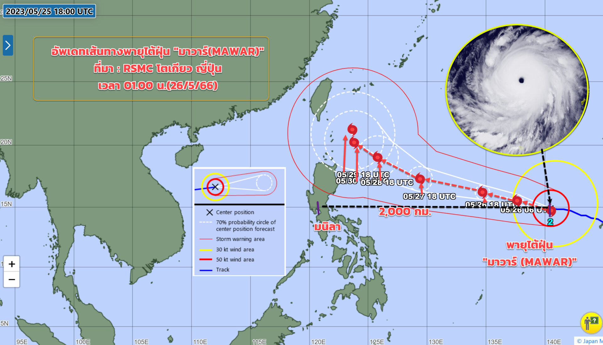 นางสาวชมภารี ชมภูรัตน์ อธิบดีกรมอุตุนิยมวิทยากล่าวว่า ขณะนี้พายุไต้ฝุ่น “มาวาร์ (MAWAR)” บริเวณมหาสมุทรแปซิฟิกมีกำลังแรงเนื่องจากยังอยู่ในทะเล โดยได้รับพลังงานจากอุณหภูมิน้ำทะเลที่อุ่นขึ้นในระยะนี้ พายุไต้ฝุ่น “มาวาร์” กำลังเคลื่อนตัวทางตะวันตกและตะวันตกเฉียงเหนือ ห่างจากกรุงมะนิลา ประเทศฟิลิปปินส์ประมาณ 2000 กิโลเมตร คาดว่า จะเคลื่อนเข้าใกล้บริเวณหัวเกาะลูซอน ประเทศฟิลิปปินส์ประมาณวันที่ 28 -30 พฤษภาคม โดยจะเคลื่อนตัวโค้งกลับไปทางเกาะไต้หวันต่อไป พายุลูกนี้ไม่มีผลกระทบโดยตรงกับประเทศไทย เพียงแต่จะดึงดูดให้ลมมรสุมตะวันตกเฉียงใต้มีกำลังแรงขึ้นตั้งแต่วันที่ 27 – 30 พฤษภาคม