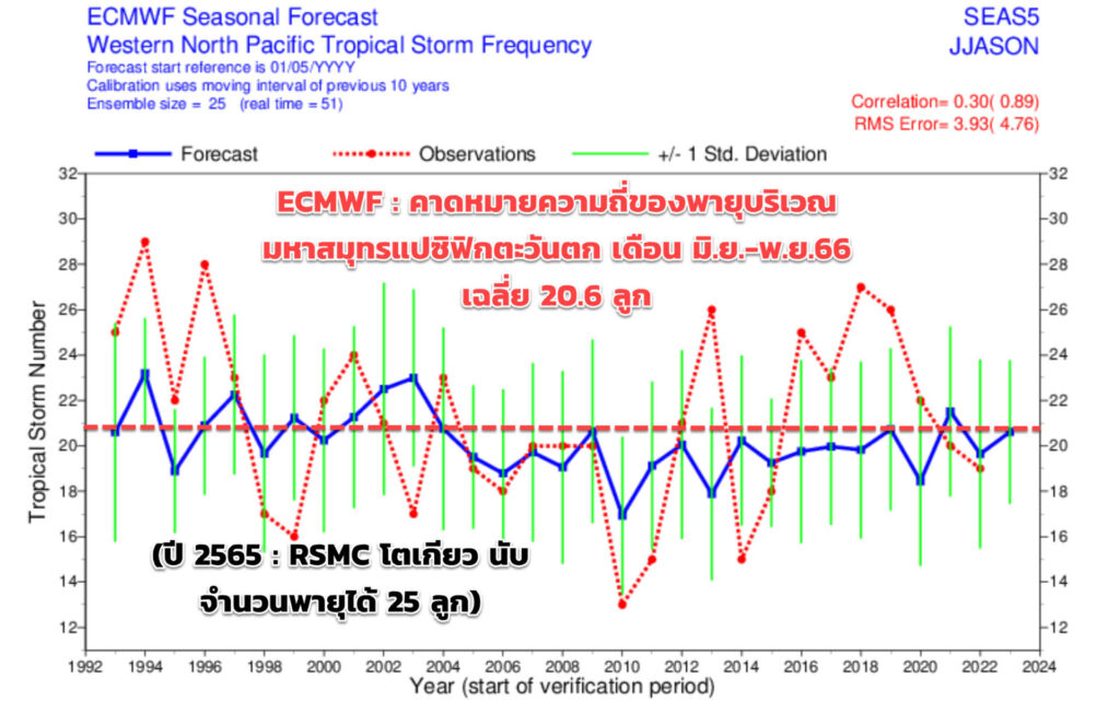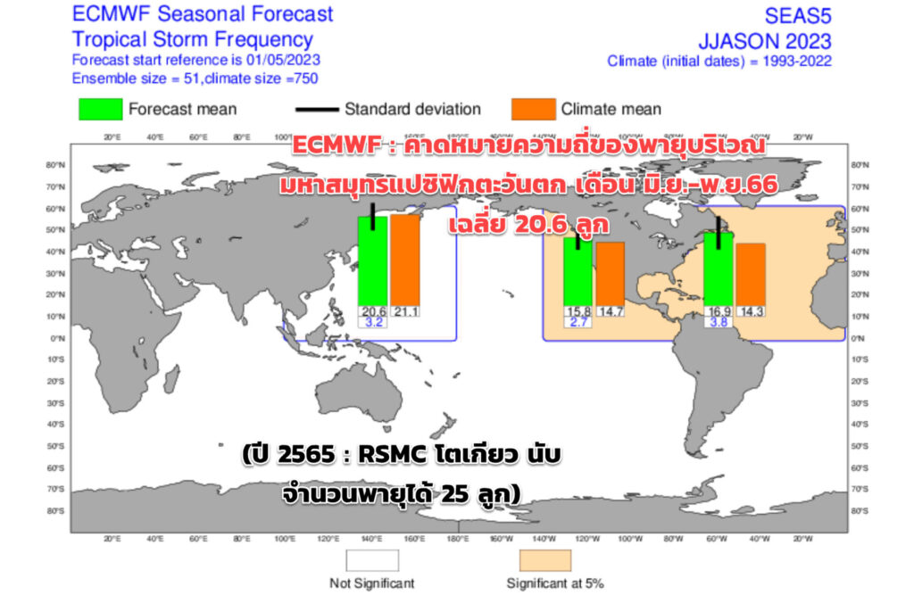 สำหรับพายุที่ก่อตัวในมหาสมุทรแปซิฟิกที่ปีหนึ่งๆ มีกว่า 20 ลูก แต่พายุที่ส่งผลกระทบต่อประเทศไทยโดยตรงเฉลี่ยปีละ 1-2 ลูก ซึ่งในปี 2566 คาดการณ์ว่า ยังเท่ากับค่าเฉลี่ย โดยอาจจะเกิดขึ้นในเดือนสิงหาคมถึงกันยายน ดังนั้นจึงขอให้ประชาชนไม่ต้องวิตกว่า จะมีพายุที่ส่งผลกระทบต่อประเทศไทยมากกว่าปกติ