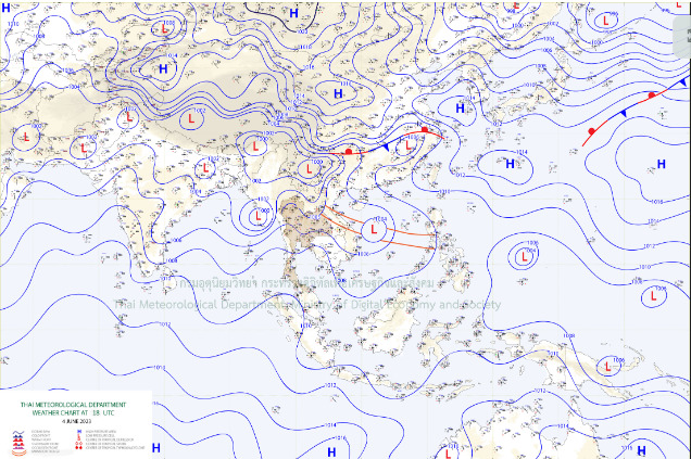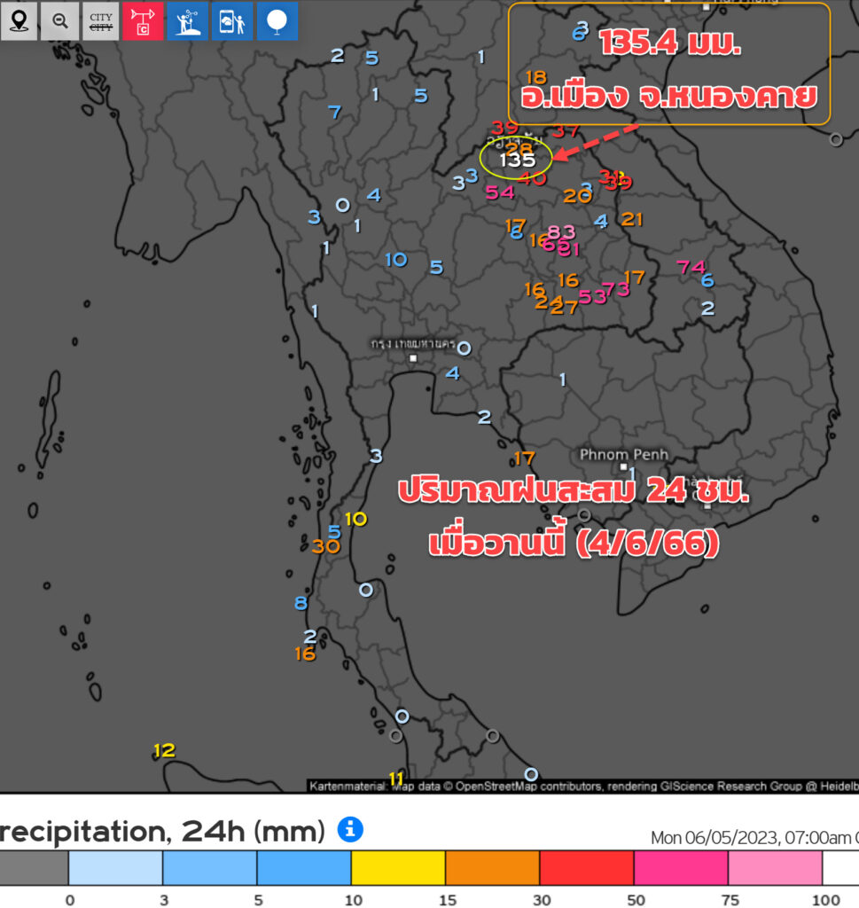 ล่าสุดมีร่องมรสุมพาดผ่านภาคตะวันออกเฉียงเหนือตอนบน ประกอบกับมรสุมตะวันตกเฉียงใต้มีกำลังแรงขึ้น เริ่มมีฝนตกหนักถึงหนักมากเกิดขึ้นทางภาคตะวันออกเฉียงเหนือตอนบน บริเวณที่ร่องมรสุมพาดผ่าน ปริมาณฝนสูงสุดเมื่อวานนี้ (4 มิ.ย.66) วัดได้ 135.4 มิลลิเมตร ที่อำเภอเมือง จังหวัดหนองคาย ส่วนภาคอื่นๆ รวมทั้ง กทม. และปริมณฑล จะมีฝนตกเพิ่มขึ้นจนถึงวันที่ 11 มิถุนายน ซึ่งจะช่วยผ่อนคลายความร้อนลงบ้าง แต่ภาคเหนือจะยังมีบางพื้นที่อากาศร้อนถึงร้อนจัด