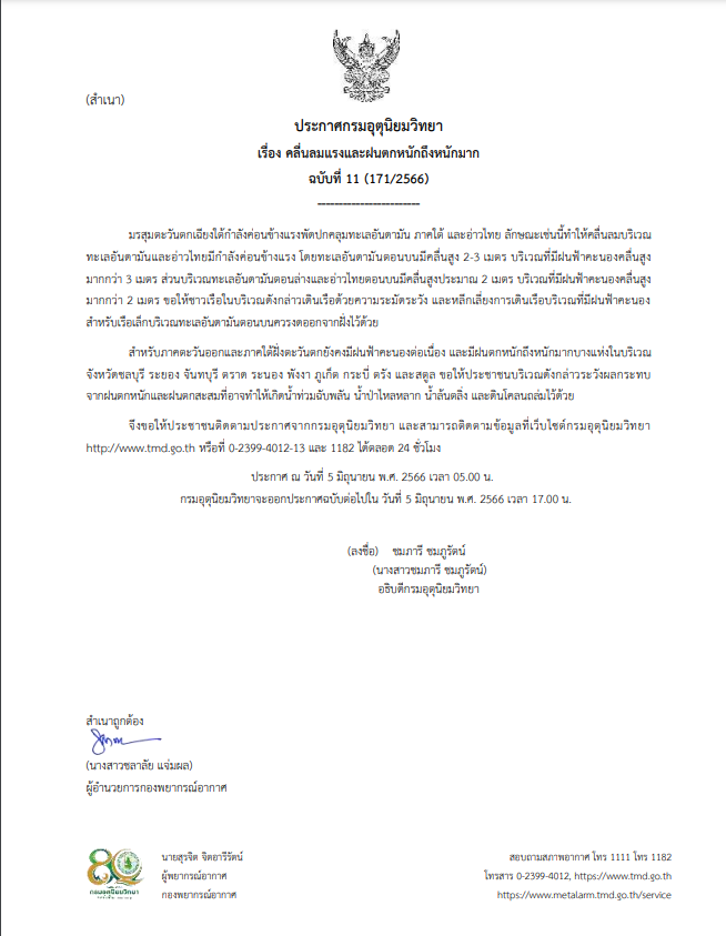 ดังนั้น ขอให้ประชาชนบริเวณดังกล่าวระวังผลกระทบจากฝนตกหนักและฝนตกสะสมที่อาจทำให้เกิดน้ำท่วมฉับพลัน น้ำป่าไหลหลาก น้ำล้นตลิ่ง และดินโคลนถล่มไว้ด้วย ตลอดจนระวังคลื่นลมที่มีกำลังค่อนข้างแรง โดยทะเลอันดามันตอนบนมีคลื่นสูง 2-3 เมตร บริเวณที่มีฝนฟ้าคะนองคลื่นสูงมากกว่า 3 เมตร ส่วนบริเวณทะเลอันดามันตอนล่างและอ่าวไทยตอนบนมีคลื่นสูงประมาณ 2 เมตร บริเวณที่มีฝนฟ้าคะนองคลื่นสูงมากกว่า 2 เมตร ขอให้ชาวเรือในบริเวณดังกล่าวเดินเรือด้วยความระมัดระวัง และหลีกเลี่ยงการเดินเรือบริเวณที่มีฝนฟ้าคะนอง สำหรับเรือเล็กบริเวณทะเลอันดามันตอนบนควรงดออกจากฝั่ง