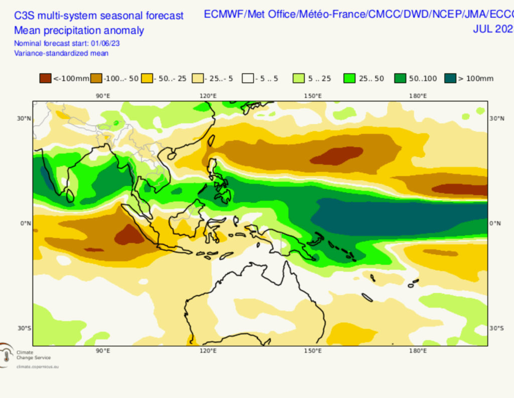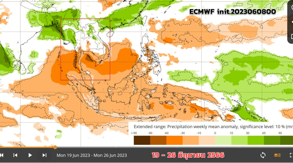 จากการพยากรณ์ความต่างจากค่าเฉลี่ยปกติของความกดอากาศที่ระดับน้ำทะเลปานกลาง (MSLP) และฝนรายเดือน 6 เดือนล่วงหน้าตั้งแต่เดือนกรกฎาคมถึงพฤศจิกายน 2566 พบปัจจัยความกดอากาศสูงจากซีกโลกใต้ (สีเหลือง – สีส้ม) ที่คาดว่า จะแผ่ขึ้นมาปกคลุม แล้วจะส่งผลให้ปริมาณฝนบริเวณประเทศไทยลดน้อยลง โดยเฉพาะภาคใต้ ซึ่งต้องติดตามผลกระทบอย่างต่อเนื่อง ประกอบกับสัญญาณการเข้าสู่สภาวะเอลนีโญเริ่มแรงขึ้น (El Niño Watch) โดยพบว่า อุณหภูมิน้ำทะเลสูงกว่าค่าปกติต่อเนื่อง ศูนย์พยากรณ์สภาพอากาศ (Climate Prediction Center) แห่งองค์การบริหารมหาสมุทรและชั้นบรรยากาศแห่งชาติสหรัฐอเมริกา (NOAA) คาดว่า จะเข้าสู่สภาวะเอลนีโญในเดือนกรกฎาคมนี้ จากการติดตามกรมอุตุนิยมวิทยาพบว่า ในเดือนพฤษภาคมที่ผ่านมา อุณหภูมิประเทศไทยสูงกว่าค่าปกติ 1.4 องศาเซลเซียส ส่วนปริมาณฝนน้อยกว่าค่าปกติร้อยละ 26 และอิทธิพลเอลนีโญจะทำให้ในเดือนตุลาคมซึ่งปกติเป็นเดือนที่ฝนตกชุกที่สุด แต่ในพ.ศ. 2566 ฝนอาจหายไปเร็ว ทำให้ฤดูฝนสั้นลง คาดว่า สภาวะเอลนีโญจะต่อเนื่องไปจนถึงเดือนกุมภาพันธ์ 2567 ซึ่งได้ส่งข้อมูลการคาดการณ์ปริมาณฝนที่จะลดลงกว่าค่าปกติร้อยละ 5 ไปยังหน่วยงานด้านบริหารจัดการน้ำให้เตรียมพร้อมรับมือแล้ว