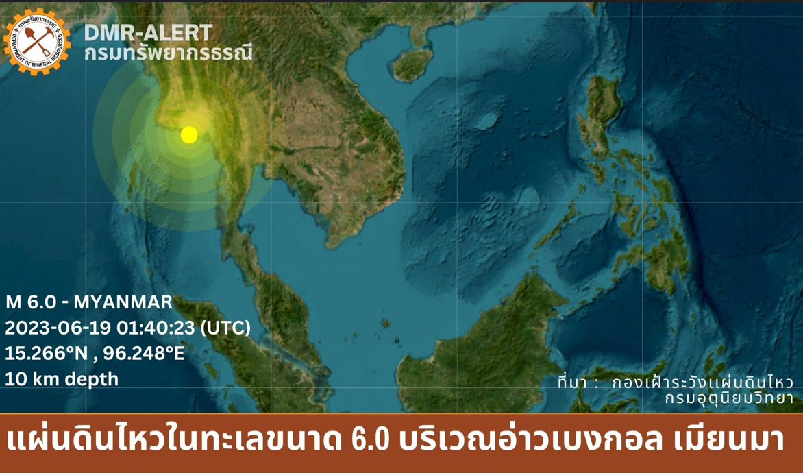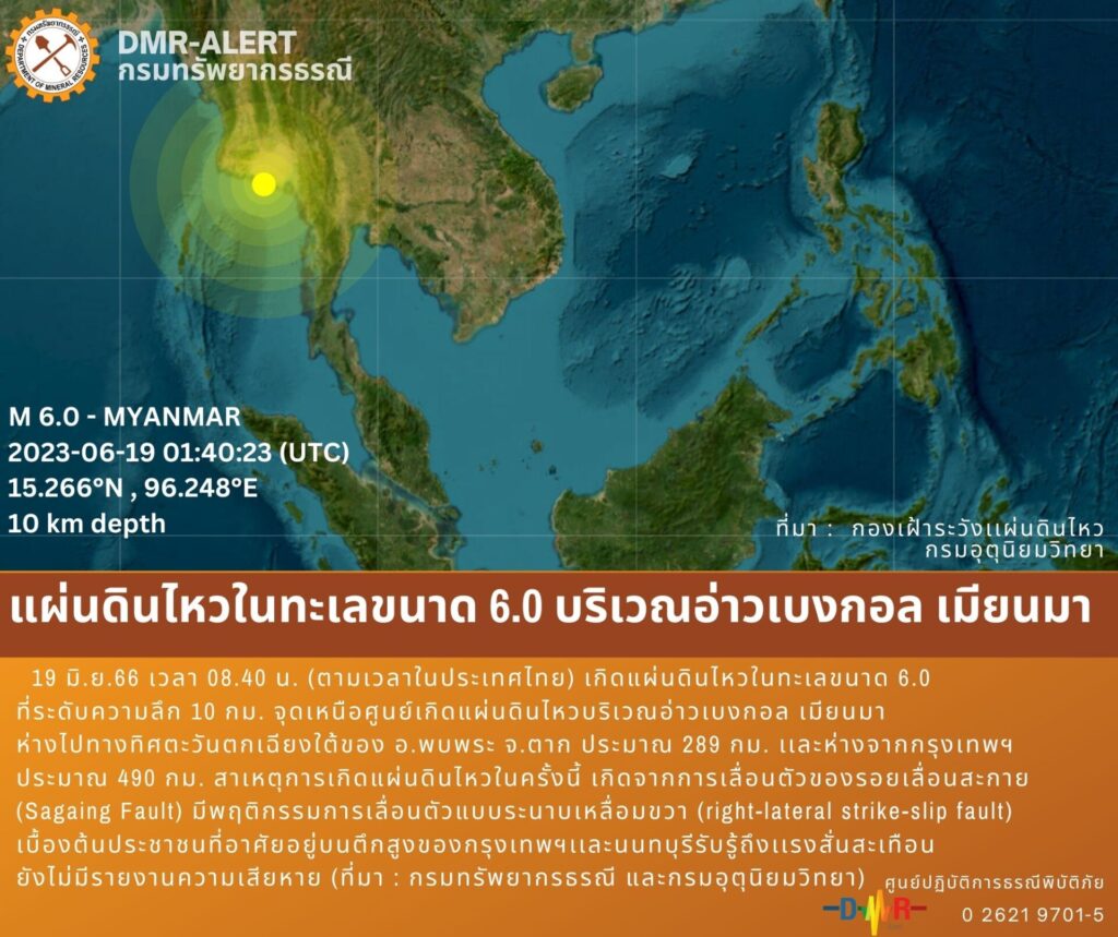 กรุงเทพฯ 19 มิ.ย.- กรมทรัพยากรธรณีเผย แผ่นดินไหวในทะเลขนาด 6.0 บริเวณอ่าวเบงกอล ประเทศเมียนมาเช้านี้ เกิดจากการเคลื่อนตัวของรอยเลื่อนสะกาย ซึ่งมีอัตราการเคลื่อนตัวประมาณ 2 เซนติเมตรต่อปี ส่วนที่รับรู้แรงสั่นไหวได้หลายพื้นที่ในกรุงเทพมหานครและใกล้เคียงเนื่องจากรองรับด้วยชั้นดินเหนียวอ่อน