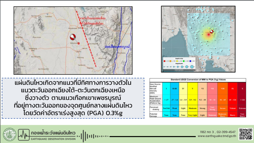 ทั้งนี้กองเฝ้าระวังแผ่นดินไหว กรมอุตุนิยมวิทยาสามารถหากลไกการเกิดแผ่นดินไหวได้พบว่า แผ่นดินไหวเกิดจากแนวที่มีทิศทางการวางตัวในแนวตะวันออกเฉียงใต้-ตะวันตกเฉียงเหนือ ซึ่งวางตัวตามแนวเทือกเขาเพชรบูรณ์ที่อยู่ทางตะวันออกของจุดศูนย์กลางแผ่นดินไหว อีกทั้งจุดศูนย์กลางไม่ได้อยู่บนรอยเลื่อนมีพลังที่สำรวจโดยกรมทรัพยากรธรณี ซึ่งอาจเป็นรอยเลื่อนที่ยังไม่ได้รับการสำรวจ (hidden fault)