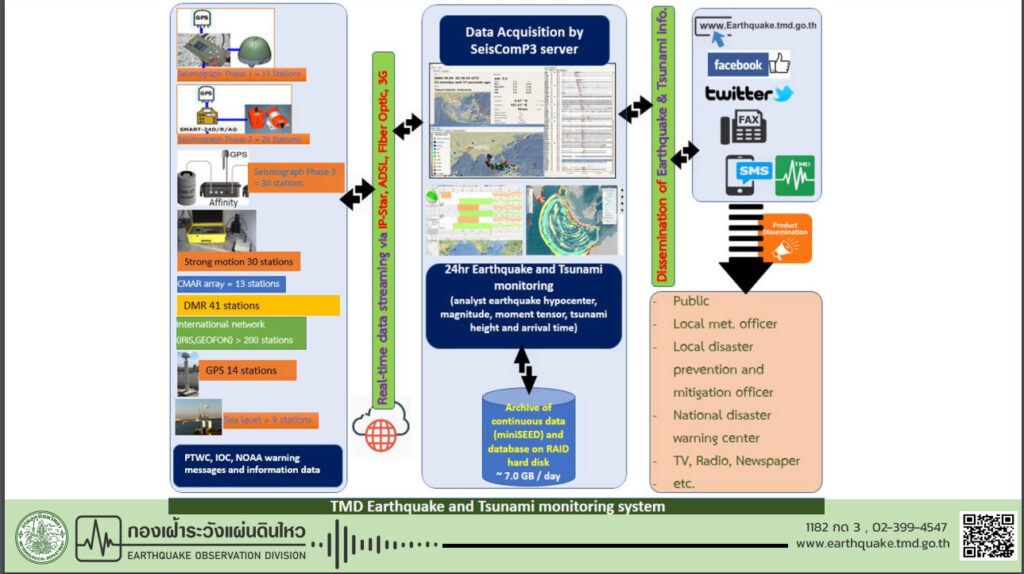 สำหรับภัยแผ่นดินไหวยังคงเป็นภัยธรรมชาติที่ยังไม่สามารถพยากรณ์ได้ การป้องกันและบรรเทาภัยแผ่นดินไหวที่มีประสิทธิภาพด้วยเทคโนโลยีและความรู้ในปัจจุบันจำเป็นต้องการข้อมูลความสั่นสะเทือนของพื้นดินที่ถูกต้องจากระบบตรวจวัดที่มีมาตรฐาน โดยกองเฝ้าระวังแผ่นดินไหว กรมอุตุนิยมวิทยา ทำหน้าที่ในการตรวจและวิเคราะห์แผ่นดินไหวทั้งภายในและต่างประเทศ โดยมีเครือข่ายสถานีตรวจแผ่นดินไหวแบบอัตโนมัติ สถานีตรวจวัดอัตราเร่งของพื้นดิน สถานีวัดการเคลื่อนตัวของเปลือกโลก และสถานีวัดระดับน้ำทะเล ติดตั้งอยู่ทั่วประเทศไทยเพื่อตรวจวัด เฝ้าระวัง และให้บริการข้อมูลต่างๆ ที่เกี่ยวกับเรื่องภัยแผ่นดินไหวในประเทศอย่างต่อเนื่อง 24 ชั่วโมง ตลอดจนแจ้งเตือนภัยให้กับพื้นที่เสียงภัยกรณีเกิดแผ่นดินไหวใหญ่ในทะเล