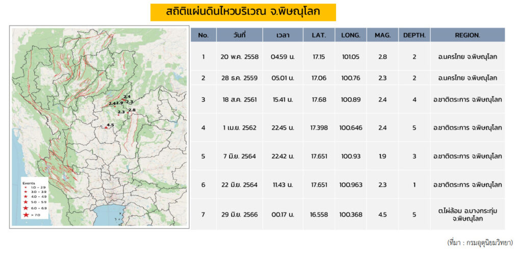 สำหรับแผ่นดินไหวครั้งนี้ซึ่งมีขนาด 4.5 เป็นขนาดที่รุนแรงที่สุดที่เคยเกิดบริเวณจังหวัดพิษณุโลก โดยสถิติที่บันทึกไว้ ครั้งแรกเมื่อวันที่ 20 พฤษภาคม 2558 ขนาด 2.8 ที่ระดับความลึก 2 กิโลเมตร หลังจากนั้นเกิดในปี 2559 2561 2562 ปีละ 1 ครั้ง ต่อมาในปี 2564 เกิด 2 ครั้ง โดยระดับความรุนแรงอยู่ระหว่าง 1.9-2.4