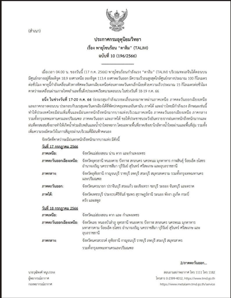 กรุงเทพฯ 17 ก.ค.- อธิบดีกรมอุตุนิยมวิทยาคาด พายุโซนร้อน “ตาลิม” จะเคลื่อนขึ้นฝั่งบริเวณรอยต่อระหว่างชายแดนประเทศจีนและเวียดนามตอนบนเย็นวันที่ 18 ก.ค. 66 และจะอ่อนกำลังลงอย่างรวดเร็ว แต่จะทำให้ภาคเหนือและอีสานตอนบนมีฝนตกหนักบางพื้นที่ ย้ำตั้งแต่ 17-20 ก.ค. ทุกภาคของไทยจะมีฝนตกเพิ่ม โดยต้องเฝ้าระวัง 64 จังหวัดที่จะมีฝนตกหนักถึงหนักมากบางแห่ง อาจทำให้เกิดน้ำท่วมฉับพลันและน้ำป่าไหลหลาก