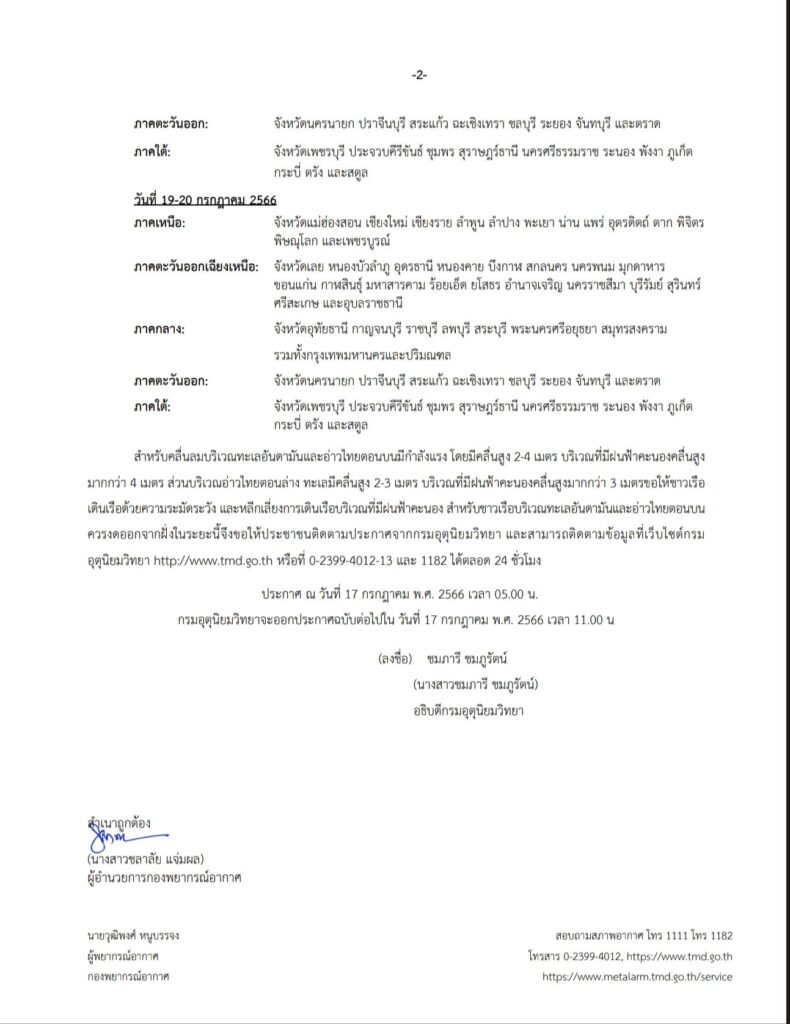 ขณะนี้ได้ออกประกาศเตือนให้เฝ้าระวังฝนตกหนักถึงหนักมากบางแห่งรวม 64 จังหวัดระหว่างวันที่ 17-20 ก.ค. เนื่องจากอาจทำให้เกิดน้ำท่วมฉับพลันและน้ำป่าไหลหลากได้ โดยเฉพาะพื้นที่ลาดเชิงเขาใกล้ทางน้ำไหลผ่านและพื้นที่ลุ่มดังนี้