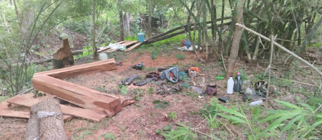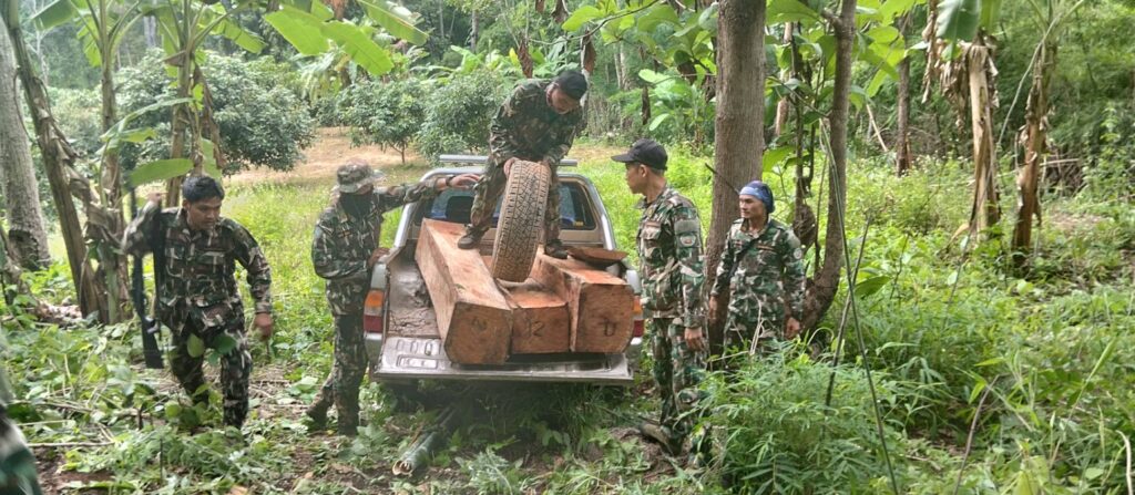 คณะเจ้าหน้าที่จึงได้ประสานเจ้าหน้าที่ทหาร ชุด ชป.13 บก.คปส.1 (จุดตรวจปางมะกง) ร่วมตรวจสอบบริเวณที่เกิดเหตุ และตรวจยึดของกลางเป็นไม้ประดู่แปรรูป 2 กอง ปริมาตร 0.83 ลูกบาศก์เมตร ค่าเสียหายของรัฐ 58,100 บาท พร้อมอุปกรณ์ที่ใช้การกระทำผิด ประกอบด้วย เลื่อยโซ่ยนต์ 4 เครื่อง มีด ขวาน รถจักรยานยนต์ และกระเป๋าเงิน